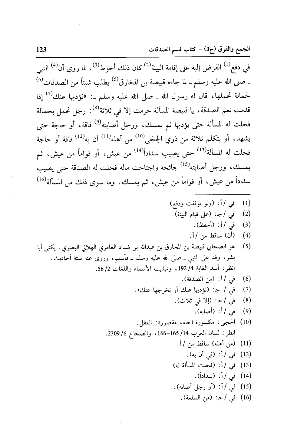 في دفع الفرض إليه على إقامة البينة كان ذلك أحوط، لما روي أن النبي - صلى الله عليه وسلم - لما جاءه قبيصة بن المخارق يطلب شيئًا من الصدقات لحمالة تحملها، قال له رسول الله - صلى الله عليه وسلم -: "نؤديها عنك إذا قدمت نعم الصدقة، يا قبيصة المسألة حرمت إلا في ثلاثة: رجل تحمل بحمالة فحلت له المسألة حتى يؤديها ثم يمسك، ورجل أصابته فاقة، أو حاجة حتى يشهد، أو يتكلم ثلاثة من ذوي الحجي من أهله أن به فاقة أو حاجة فحلت له المسألة حتى يصيب سدادًا من عيش، أو قوامًا من عيش، ثم يمسك، ورجل أصابته جائحة واجتاحت ماله فحلت له الصدقة حتى يصيب سدادًا من عيش، أو قوامًا من عيش، ثم يمسك. وما سوى ذلك من المسألة