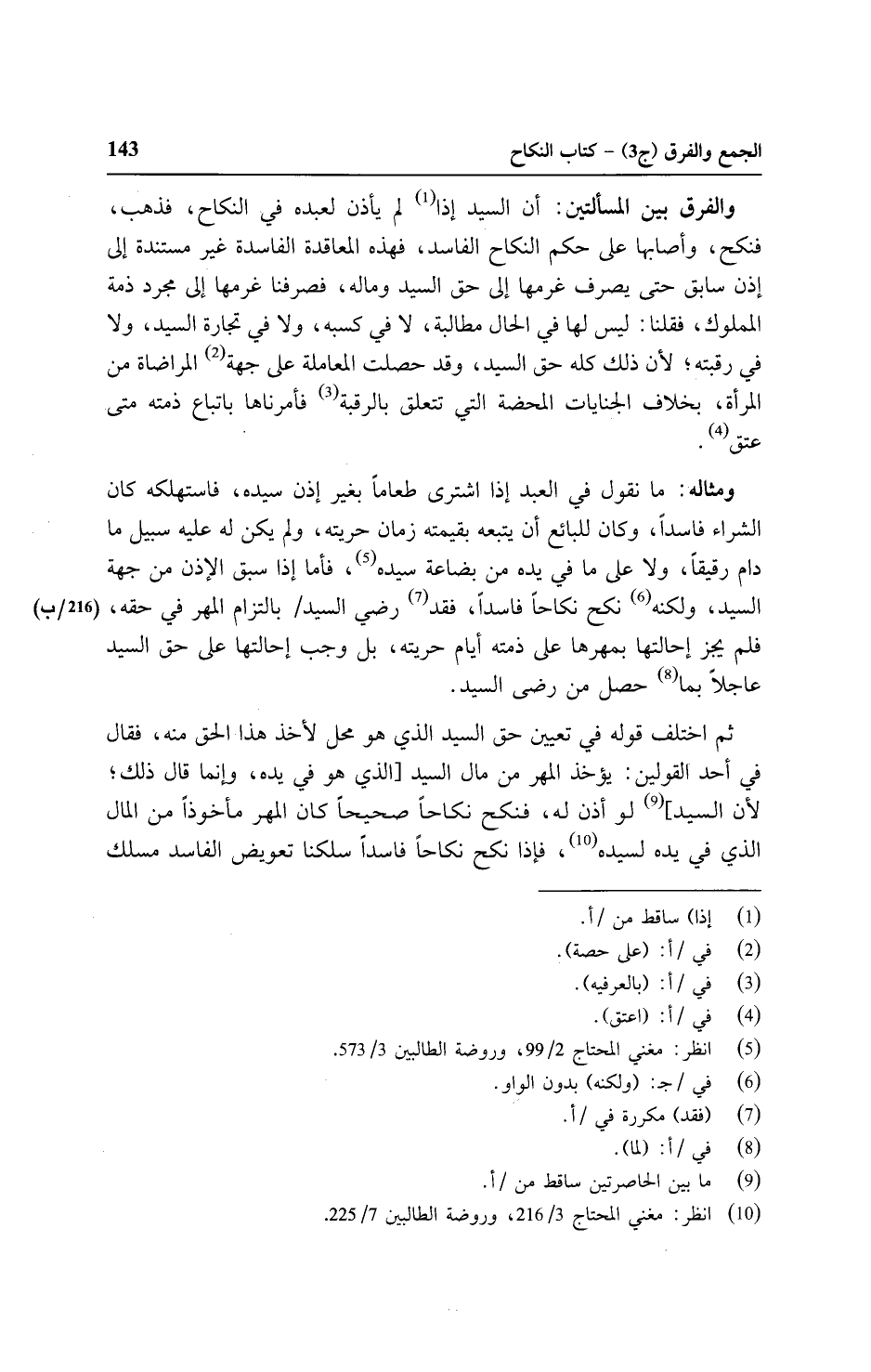 ومثاله: ما نقول في العبد إذا اشترى طعامًا بغير إذن سيده، فاستهلكه كان الشراء فاسدًا، وكان للبائع أن يتبعه بقيمته زمان حريته، ولم يكن له عليه سبيل ما دام رقيقًا، ولا على ما في يده من بضاعة سيده، فأما إذا سبق الإذن من جهة السيد، ولكنه نكح نكاحًا فاسدًا، فقد رضي السيد/ بالتزام المهر في حقه، فلم يجز إحالتها بمهرها على ذمته أيام حريته، بل وجب إحالتها على حق السيد عاجلًا بما حصل من رضي السيد.