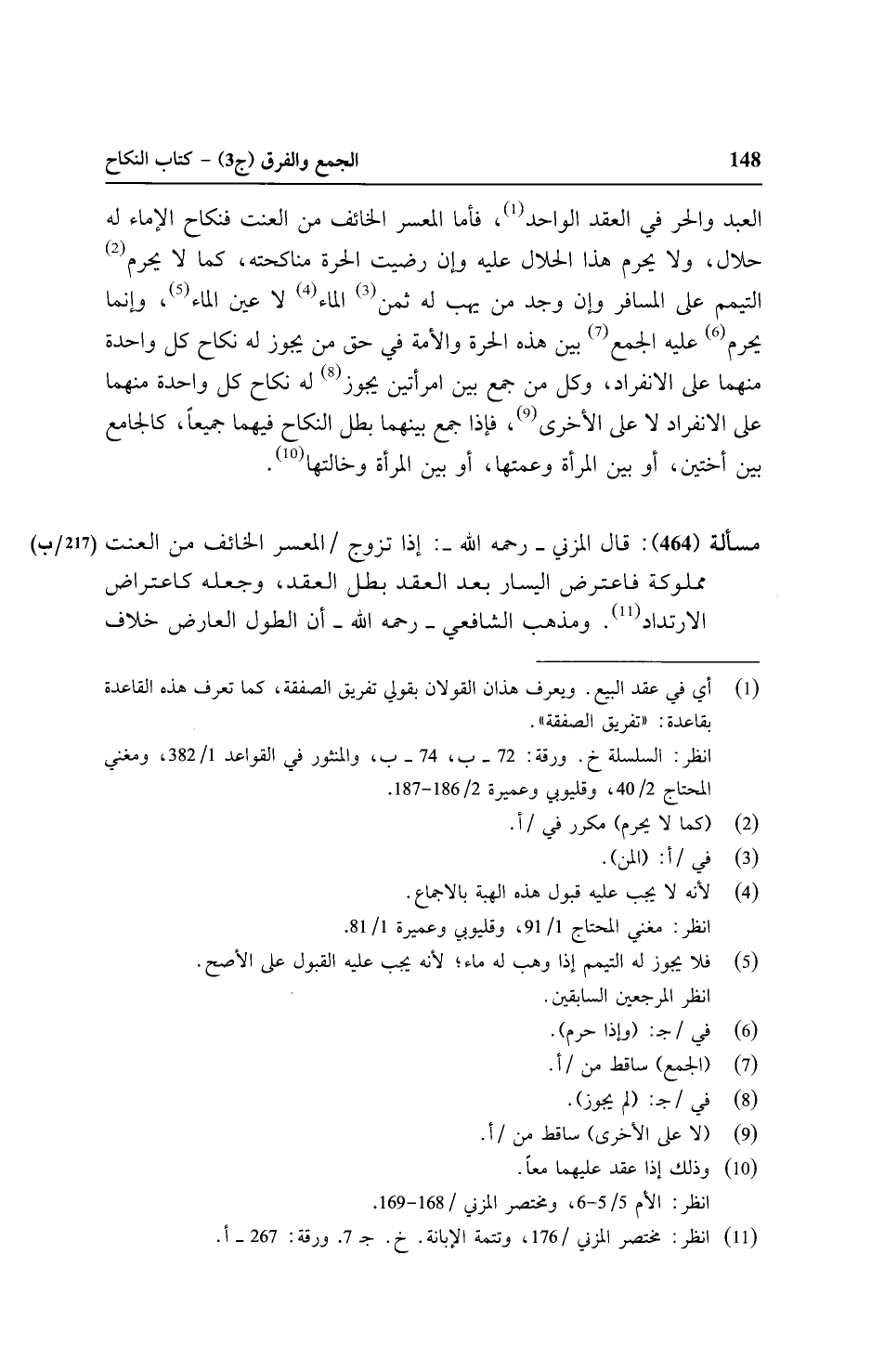 العبد والحر في العقد الواحد، فأما المعسر الخائف من العنت فنكاح الإماء له حلال، ولا يحرم هذا الحلال عليه وإن رضيت الحرة مناكحته، كما لا يحرم التيمم على المسافر وإن وجد من يهب له ثمن الماء لا عين الماء، وإنما يحرم عليه الجمع بين هذه الحرة والأمة في حق من يجوز له نكاح كل واحدة منهما على الانفراد، وكل من جمع بين امرأتين يجوز له نكاح كل واحدة منهما على الانفراد لا على الأخرى، فإذا جمع بينهما بطل النكاح فيهما جميعًا، كالجامع بين أختين، أو بين المرأة وعمتها، أو بين المرأة وخالتها.