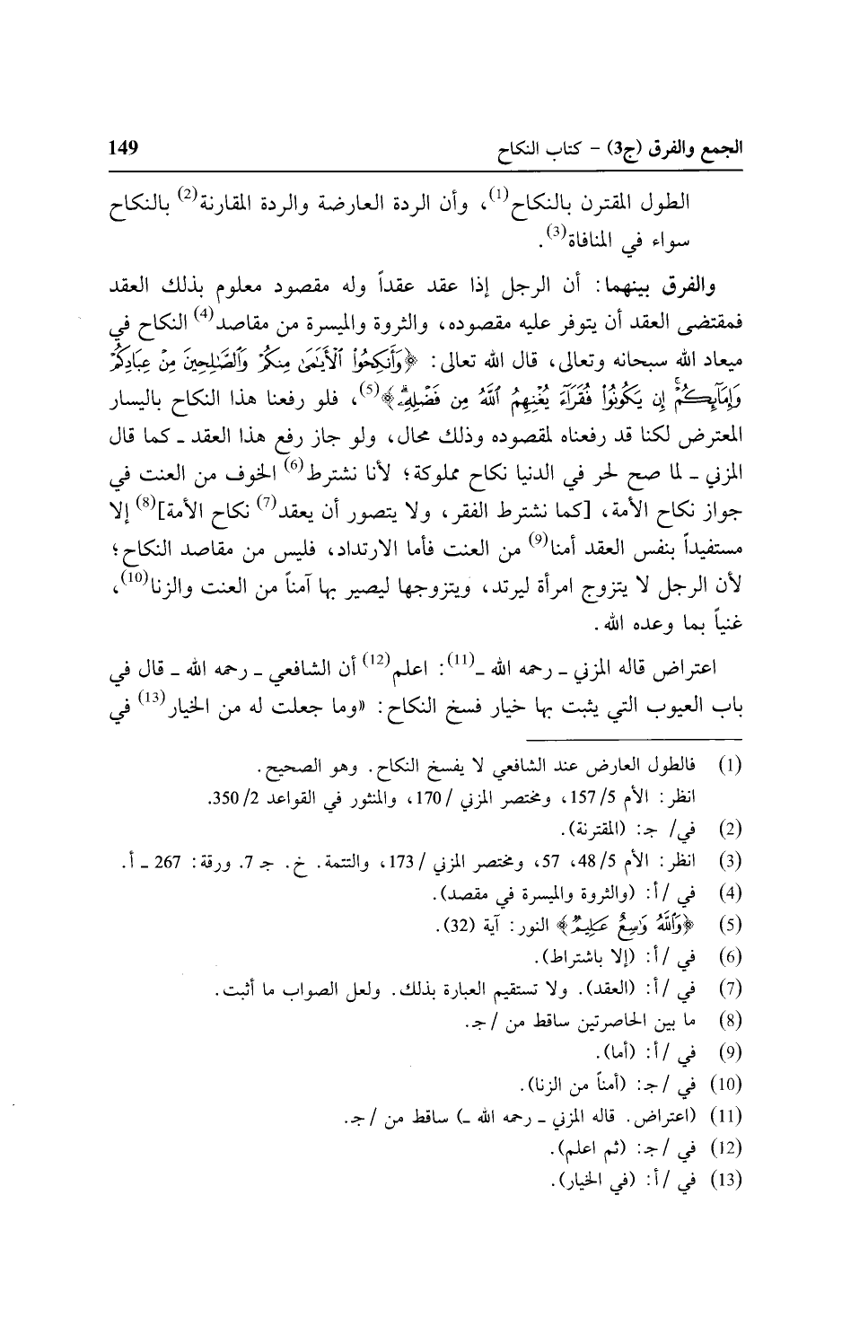 والفرق بينهما: أن الرجل إذا عقد عقدًا وله مقصد معلوم بذلك العقد فمقتضى العقد أن يتوفر عليه مقصوده، والثروة والميسرة من مقاصد النكاح في ميعاد الله سبحانه وتعالى، قال الله تعالى: {وأَنكِحُوا الأَيَامَى مِنكُمْ والصَّالِحِينَ مِنْ عِبَادِكُمْ وإمَائِكُمْ إن يَكُونُوا فُقَرَاءَ يُغْنِهِمُ اللَّهُ مِن فَضْلِهِ} فلو رفعنا هذا النكاح باليسار المعترض لكنا قد رفعناه لمقصوده وذلك محال، ولو جاز رفع هذا العقد - كما قال المزني - لما صح لحر في الدنيا نكاح مملوكة؛ لأنا نشترط الخوف من العنت في جواز نكاح الأمة [كما نشترط الفقر، ولا يتصور أن يعقد نكاح الأمة] إلا مستفيدًا بنفس العقد أمنا من العنت فأما الارتداد، فليس من مقاصد النكاح؛ لأن الرجل لا يتزوج امرأة ليرتد، ويتزوجها ليصير بها آمنًا من العنت والزنا، غنيًا بما وعده الله.
