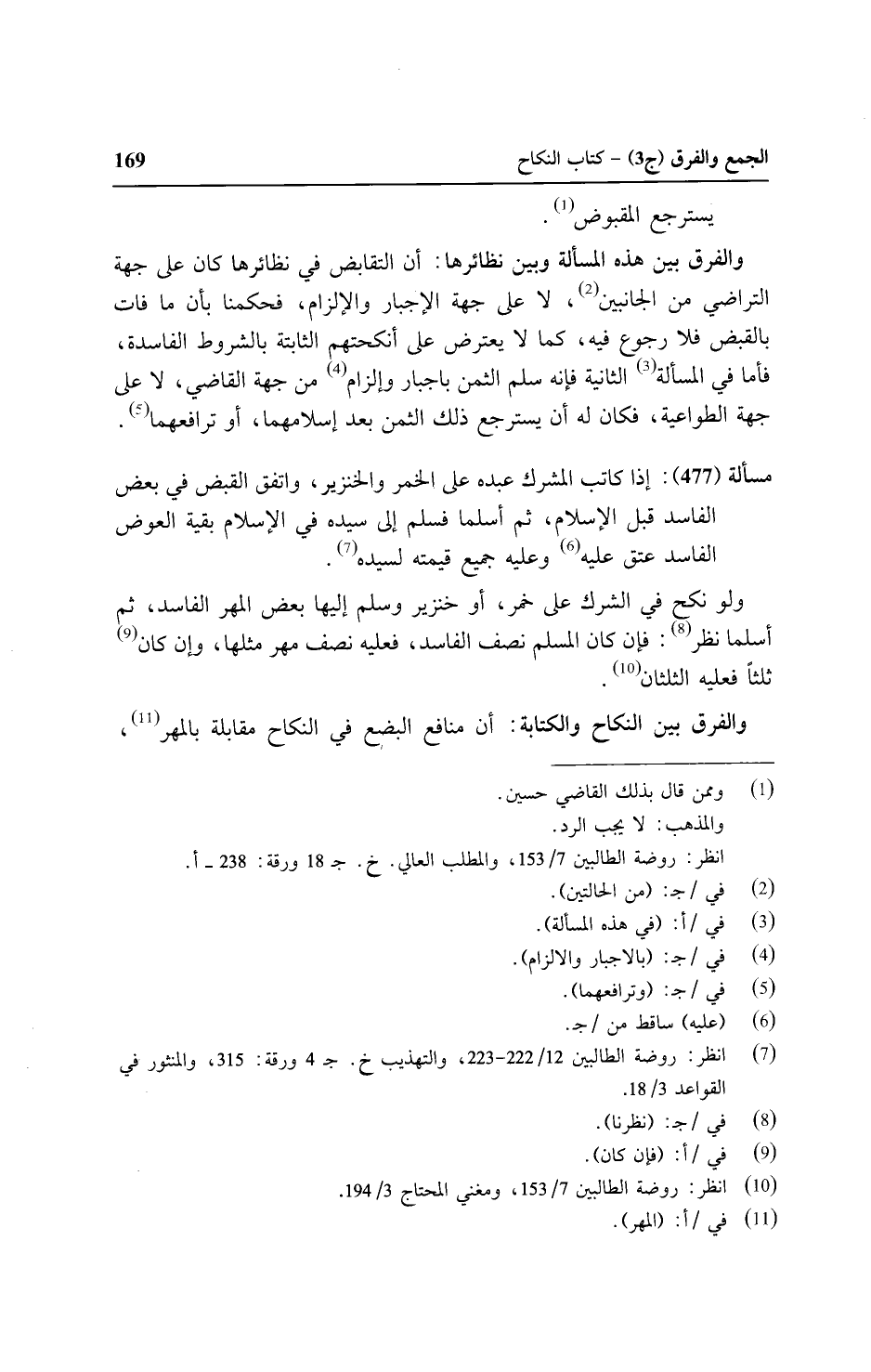 والفرق بين هذه المسألة وبين نظائرها: أن التقابض في نظائرها كان على جهة التراضي من الجانبين، لا على جهة الإجبار والإلزام، فحكمنا بأن ما فات بالقبض فلا رجوع فيه، كما لا يعترض على أنكحتهم الثابتة بالشروط الفاسدة، فأما في المسألة الثانية فإنه سلم الثمن بإجبار وإلزام من جهة القاضي، لا على جهة الطواعية، فكان له أن يسترجع ذلك الثمن بعد إسلامهما، أو ترافعهما.