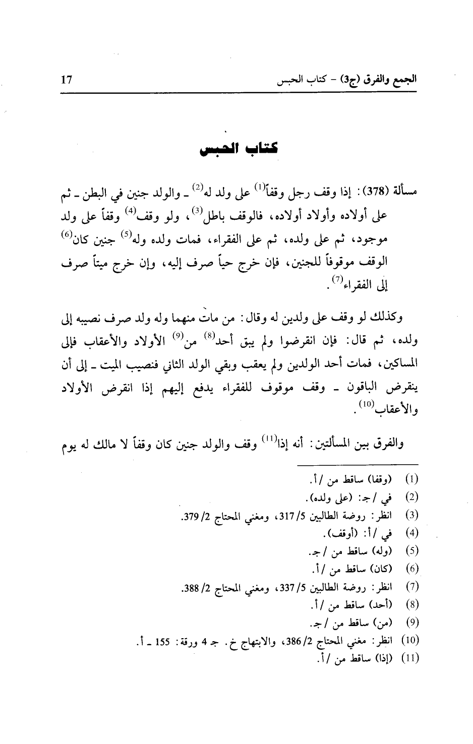 مسألة (٣٧٨): إذا وقف رجل وقفا على ولد له - والولد جنين في البطن- ثم على أولاده وأولاد أولاده، فالوقف باطل، ولو وقف وقفا على ولد موجود، ثم على ولده، ثم على الفقراء، فمات ولده وله جنين كان الوقف موقوفا للجنين، فإن خرج حيا صرف إليه، وإن خرج ميتا صرف إلى الفقراء.