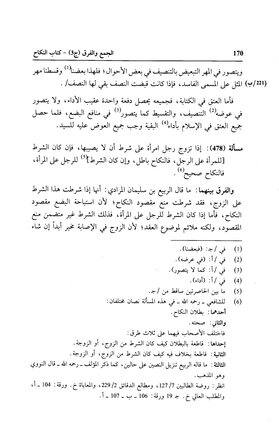 مسألة (٤٧٨): إذا تزوج رجل امرأة على شرط أن لا يصيبها، فإن كان الشرط [للمرأة على الرجل، فالنكاح باطل، وإن كان الشرط] للرجل على المرأة، فالنكاح صحيح.