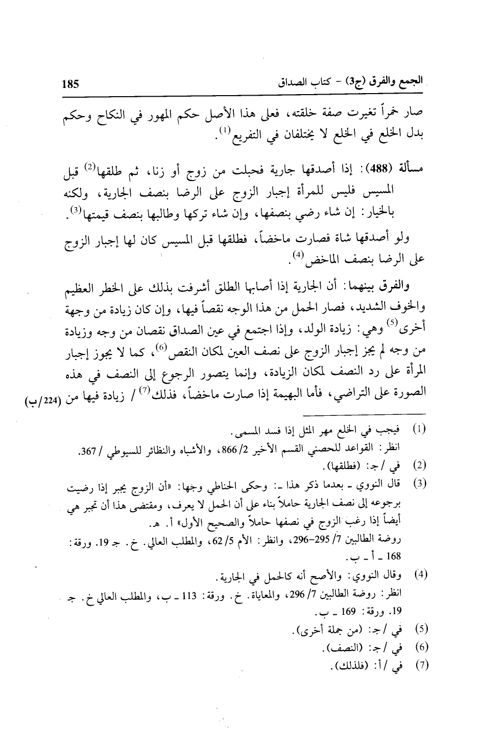 مسألة (٤٨٨): إذا أصدقها جارية فحبلت من زوج أو زنا، ثم طلقها قبل المسيس فليس للمرأة إجبار الزوج على الرضا بنصف الجارية، ولكنه بالخيار: إن شاء رضي بنصفها، وإن شاء تركها وطالبها بن بنصف قيمتها. ولو أصدقها شاة فصارت ماخضاً، طلقها قبل المسيس كان لها إجبار الزوج على الرضا بنصف الماخض.