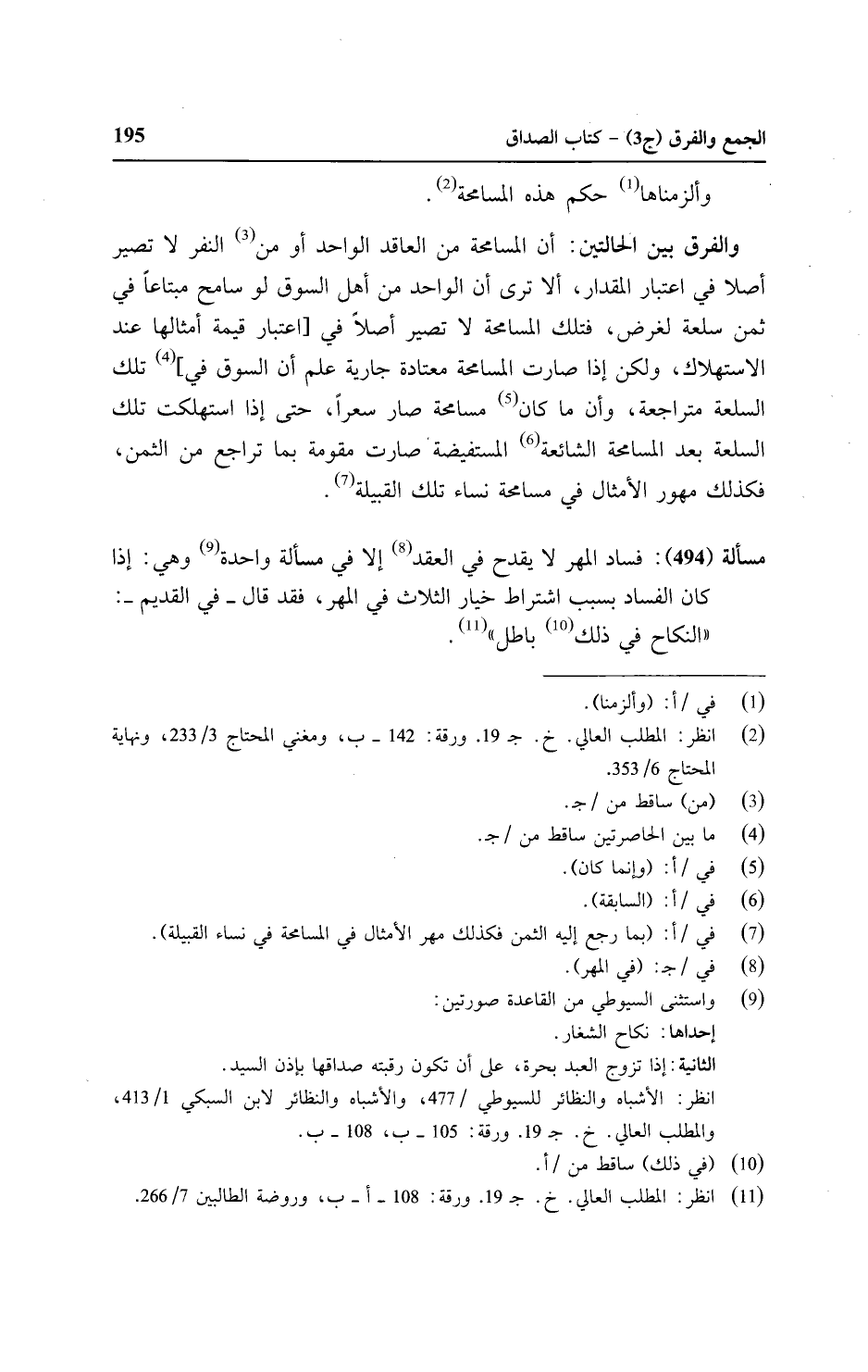 والفرق بين الحالتين: أن المسامحة من العاقد الواحد أو من النفر لا تصير أصلًا في اعتبار المقدار, ألا ترى أن الواحد من أهل السوق لو سامح مبتاعًا في ثمن سلعة لغرض, فتلك المسامحة لا تصير أصلًا في] اعتبار قيمة أمثالها عند الاستهلاك, ولكن إذا صارت المسامحة معتادة جارية علم أن السوق في [تلك السلعة متراجعة, وإن ما كان مسامحة صار سعرًا, حتى إذا استهلكت تلك السلعة بعد المسامحة الشائعة المستفيضة صارت مقومة بما تراجع من الثمن, فكذلك مهور الأمثال في مسامحة نساء تلك القبيلة.