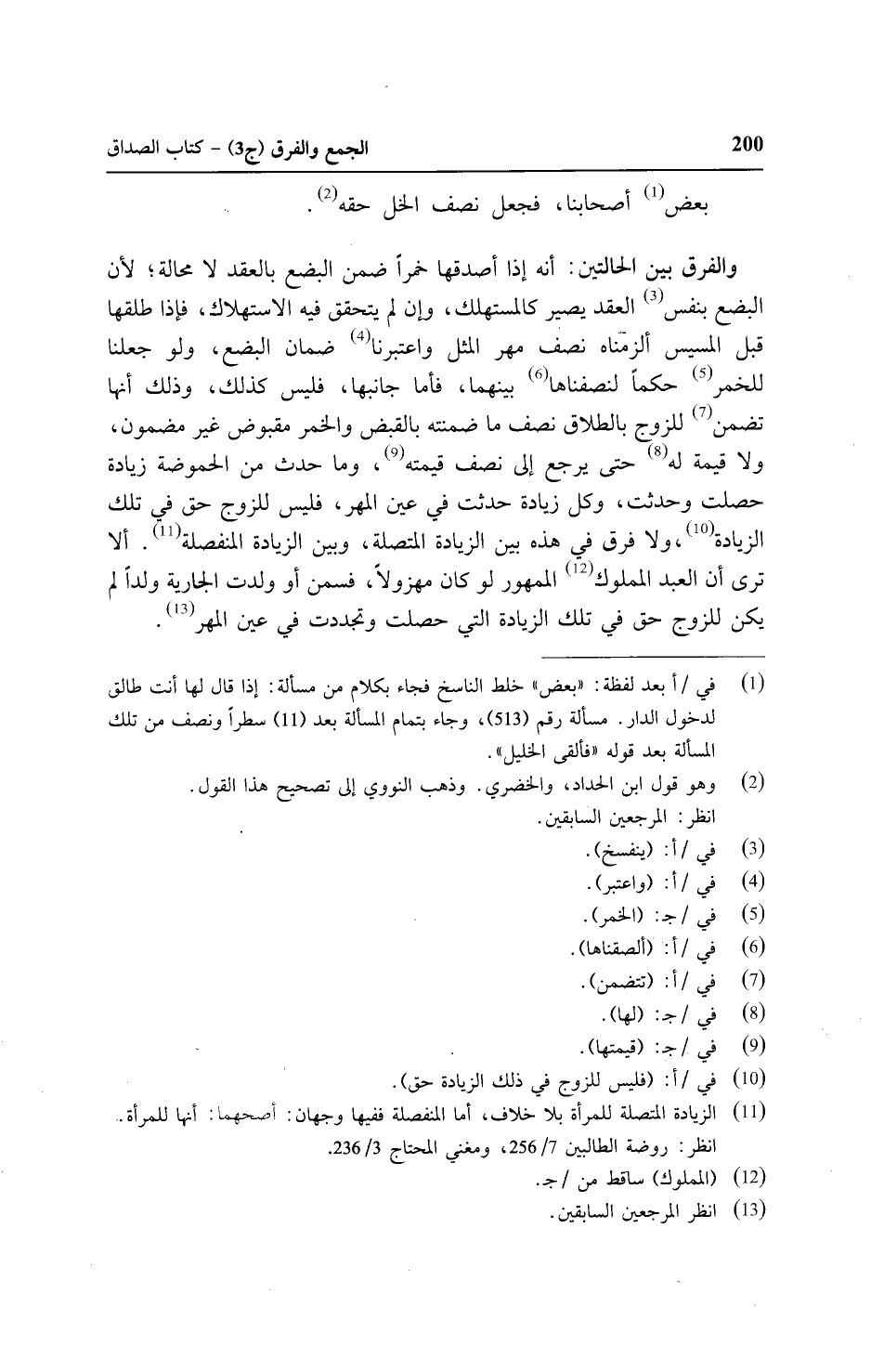 والفرق بين الحالتين: أنه إذا أصدقها خمرًا ضمن البضع بالعقد لا محالة؛ لأن البضع بنفس العقد يصير كالمستهلك, وإن لم يتحقق فيه الاستهلاك, فإذا طلقها قبل المسيس ألزمناه نصف مهر المثل واعتبرنا ضمان البضع, ولو جعلنا للخمر حكمًا لنصفناها بينهما, فأما جانبها, فليس كذلك, وذلك أنها تضمن للزوج بالطلاق نصف ما ضمنته بالقبض والخمر مقبوض غير مضمون, ولا قيمة له حتى يرجع إلى نصف قيمته, وما حدث من الحموضة زيادة حصلت وحدثت, وكل زيادة حدثت في عين المهر, فليس للزوج حق في تلك الزيادة, ولا فرق في هذه بين الزيادة المتصلة, وبين الزيادة المنفصلة, ألا ترى أن العبد المملوك الممهور لو كان مهزولًا, فسمن أو ولدت الجارية ولدًا لم يكن للزوج حق في تلك الزيادة التي حصلت وتجددت في عين المهر.
