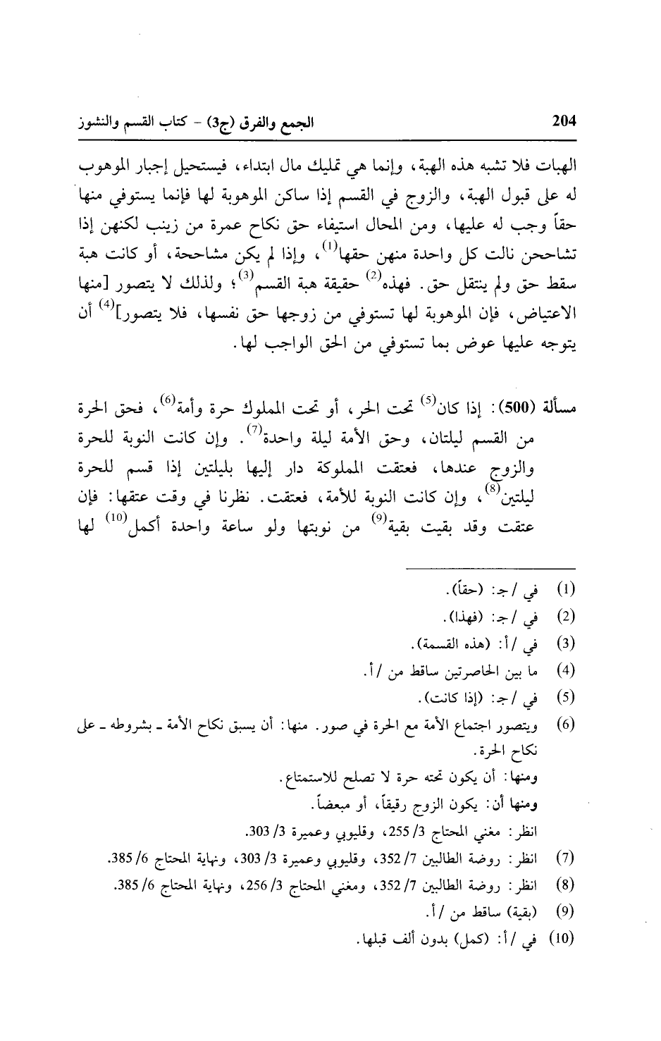 مسألة (٥٠٠): إذا كان تحت الحر, أو تحت المملوك حرة وأمة, فحق الحرة من القسم ليلتان, وحق الأمة ليلة واحدة, وإن كانت النوبة للحرة والزوج عندها, فعتقت المملوكة دار إليها بليلتين إذا قسم للحرة ليلتين, وإن كانت النوبة للأمة, فعتقت, نظرنا في وقت عتقها: فإن عتقت وقد بقيت بقية من نوبتها ولو ساعة واحدة أكمل لها