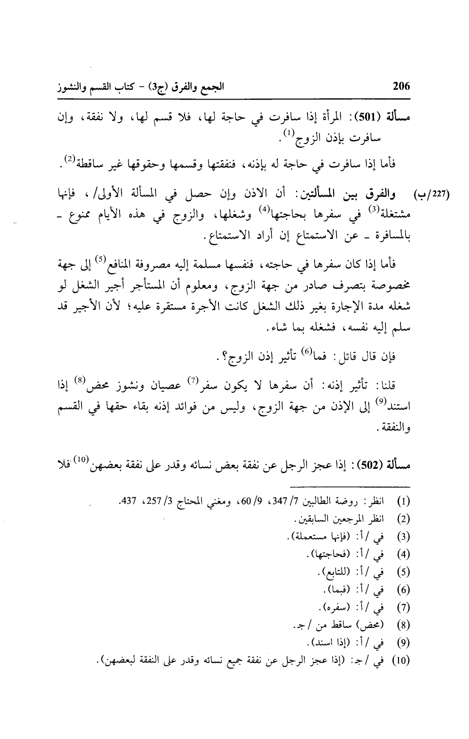 والفرق بين المسألتين: أن الإذن وإن حصل في المسألة الأولى (٢٢٧/ ب) , فإنها مشتغلة في سفرها بحاجتها وشغلها, والزوج في هذه الأيام ممنوع بالمسافرة - عن الاستمتاع إن أراد الاستمتاع.