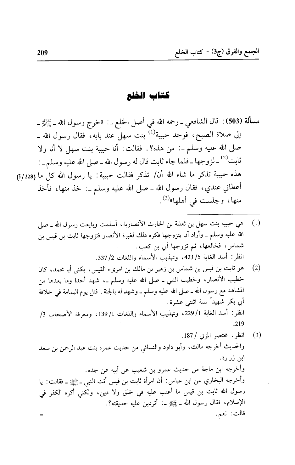 مسألة (٥٠٣): قال الشافعي - رحمه الله في أصل الخلع -: " خرج رسول الله - صلى الله عليه وسلم - إلى صلاة الصبح, فوجد حبيبة بنت سهل عن بابه, فقال رسول الله - صلى الله عليه وسلم -: من هذه؟ فقالت: أنا حبيبة بنت سهل لا أنا ولا ثابت - لزوجها - فلما جاء ثابت قال له رسول الله - صلى الله عليه وسلم -: هذه حبيبة تذكر ما شاء الله أن تذكر فقالت حبيبة: يا رسول الله كل ما أعطاني عندي, فقال رسول الله - صلى الله عليه وسلم -: خذ منها, فأخذ منها, وجلست في أهلها".
