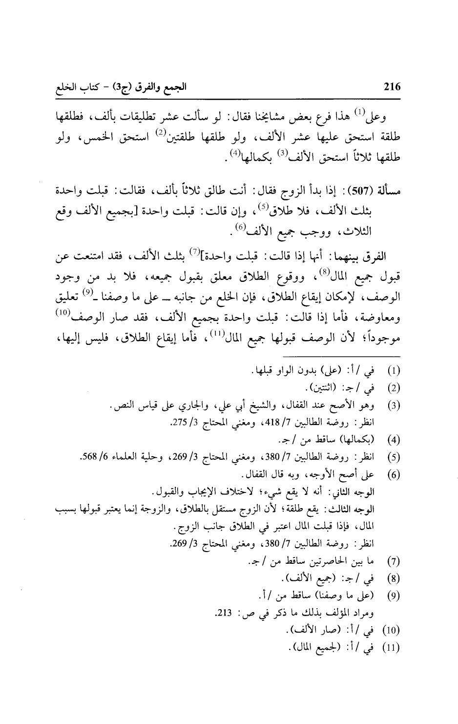 مسألة (٥٠٧): إذا بدأ الزوج فقال: أنت طالق ثلاثًا بألف, فقالت: قبلت واحدة بثلث الألف, فلا طلاق, وإن قالت: قبلت واحدة] بجميع الألف وقع الثلاث, ووجب جميع الألف.