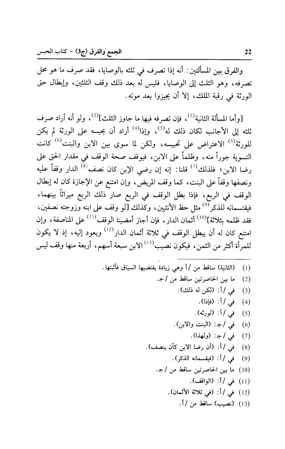 ] وأما المسألة الثانية، فإن تصرفه فيها ما جاوز الثلث [، ولو أنه أراد صرف ثلثه إلى الأجانب لكان ذلك له، وإذا أراد أن يحبسه على الورثة لم يكن للورثة الاعتراض على تحبيسه، ولكن لما سوى بين الابن والبنت كانت التسوية جورا منه، وظلما على الابن، فيوقف صحة الوقف في مقدار الحق على رضا الابن؛ فلذلك قلنا: إنه إن رضي الابن كان نصف الدار وقفا عليه ونصفها وقفا على البنت، كما وقف المريض، وإن امتنع عن الإجازة كان له إبطال الوقف في الربع، فإذا بطل الوقف في الربع صار ذلك الربع ميراثا بينهما، فيقتسمانه للذكر مثل حظ الأنثيين، وكذلك] لو وقف على ابنه وزوجته نصفين، فقد ظلمه بثلاثة [أثمان الدار، فإن أجاز أمضينا الوقف على المناصفة، وإن امتنع كان له أن يبطل الوقف في ثلاثة أثمان الدار ويعود إليه، إذ لا يكون للمرأة أكثر من الثمن، فيكون نصيب الابن سبعة أسهم، أربعة منها وقف ليس
