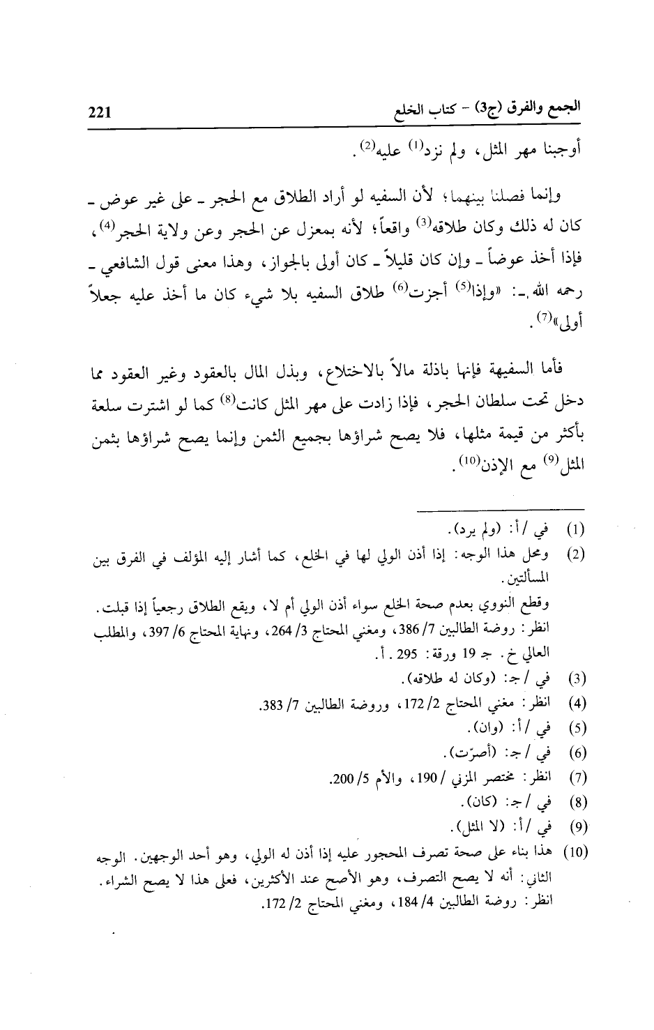 وإنما فصلنا بينهما؛ لأن السفيه لو أراد الطلاق مع الحجر - على غير عوض - كان له ذلك وكان طلاقه واقعًا؛ لأنه بمعزل عن الحجر وعن ولاية الحجر, فإذا أخذ عوضًا - وإن كان قليلًا - كان أولى بالجواز, وهذا معنى قول الشافعي - رحمه الله -: "وإذا أجزت طلاق السفيه بلا شيء كان ما أخذ عليه جعلًا أولى".