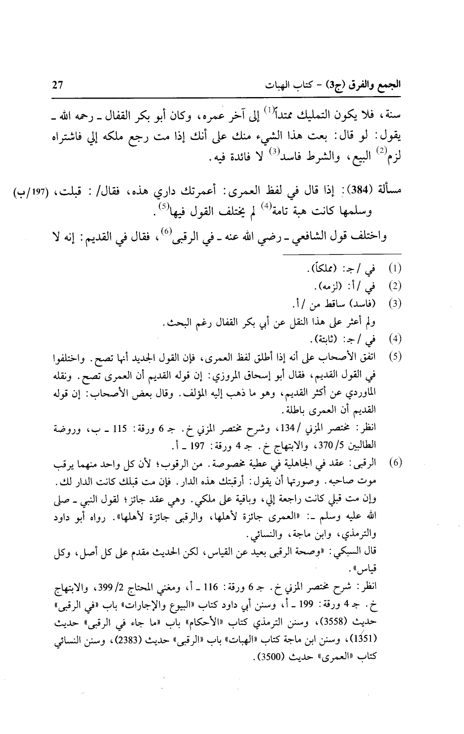مسألة (٣٨٤): إذا قال في لفظ العمرى: أعمرتك داري هذه، فقال / (١٩٧/ب): قبلت، وسلمها كانت هبة تامة لم يختلف القول فيها.