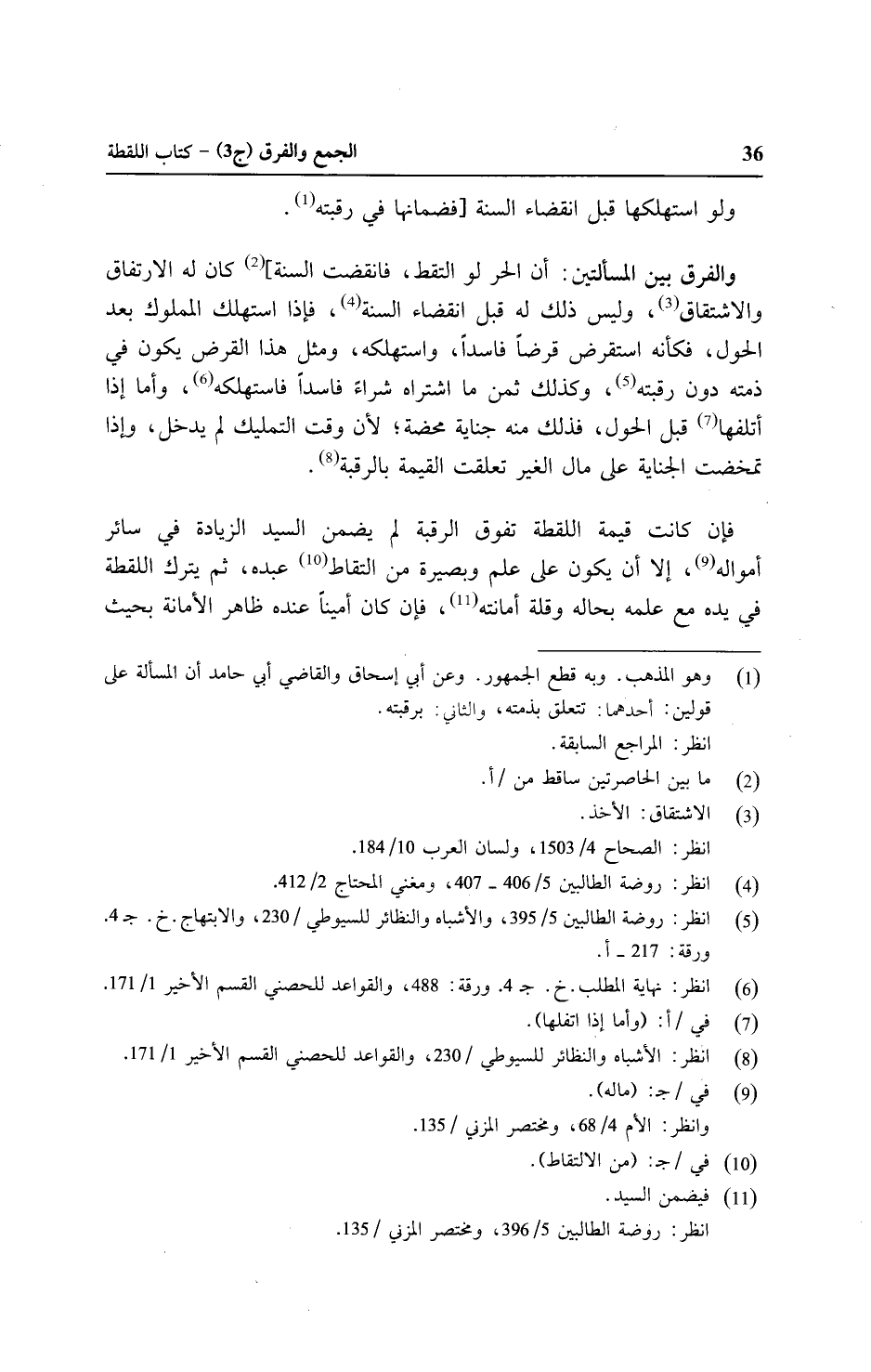 والفرق بين المسألتين: أن الحر لو التقط, فانقضت السنة [كان له الارتفاق والاشتقاق, وليس ذلك له قبل انقضاء السنة, فإذا استهلك المملوك بعد الحول, فكأنه استقرض قرضًا فاسدًا, واستهلكه, ومثل هذا القرض يكون في ذمته دون رقبته, وكذلك ثمن ما اشتراه شراء فاسدًا فاستهلكه, وأما إذا أتلفها قبل الحول, فذلك منه جناية محضة؛ لأن وقت التمليك لم يدخل, وإذا تمخضت الجناية على مال الغير تعلقت القيمة بالرقبة.