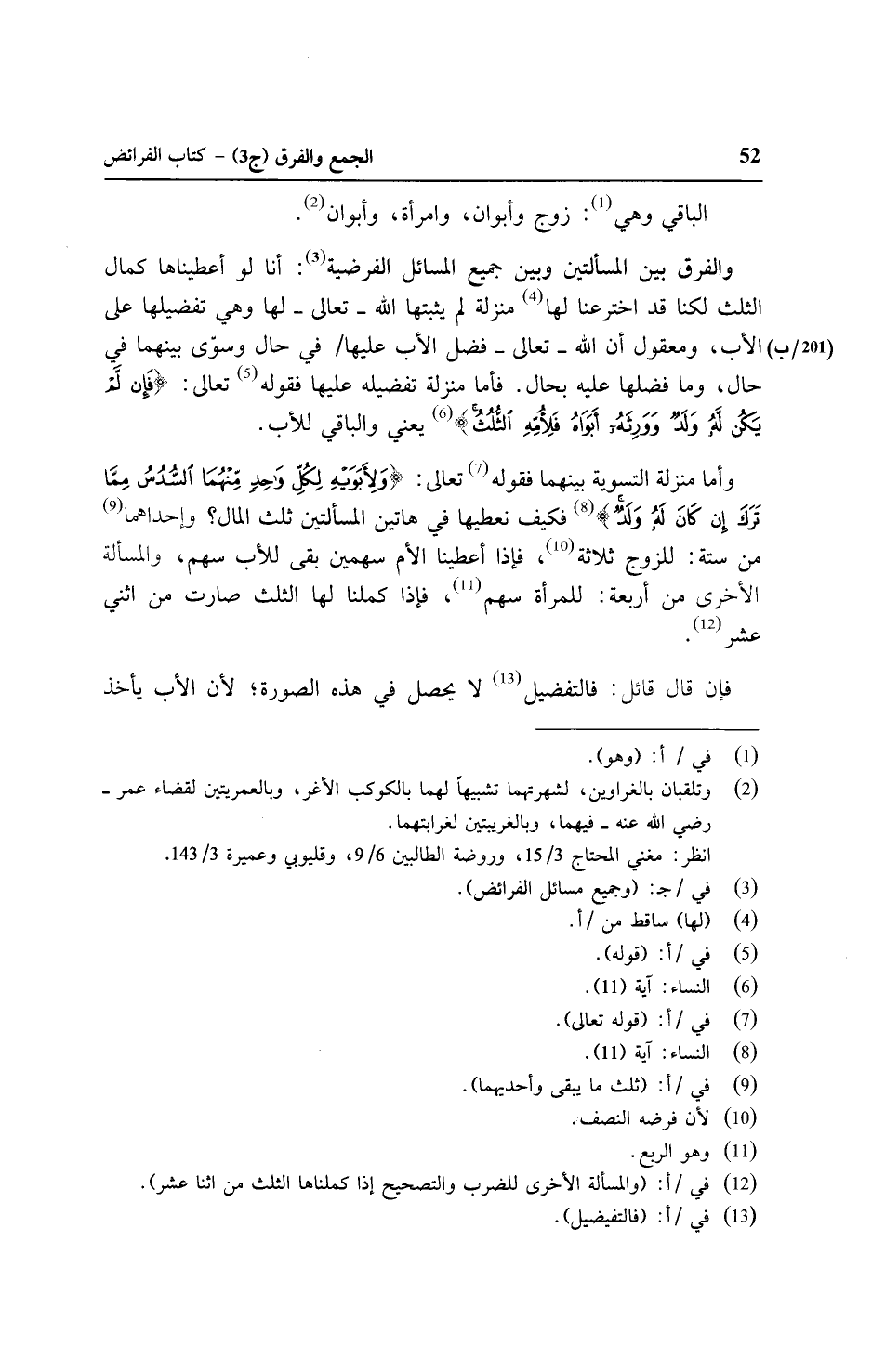 والفرق بين المسألتين وبين جميع المسائل الفرضية: أنا لو أعطيناها كمال الثلث لكنا قد اخترعنا لها منزلة لم يثبتها الله - تعالى - لها وهي تفضيلها على الأب, ومعقول أن الله - تعالى - فضل الأب عليها في حال وسوى بينهما في حال, وما فضلها عليه بحال, فأما منزلة تفضيله عليها فقوله تعالى: {فَإِن لَّمْ يَكُن لَّهُ وَلَدٌ وَوَرِثَهُ أَبَوَاهُ فَلأُمِّهِ الثُّلُثُ} يعني والباقي للأب.