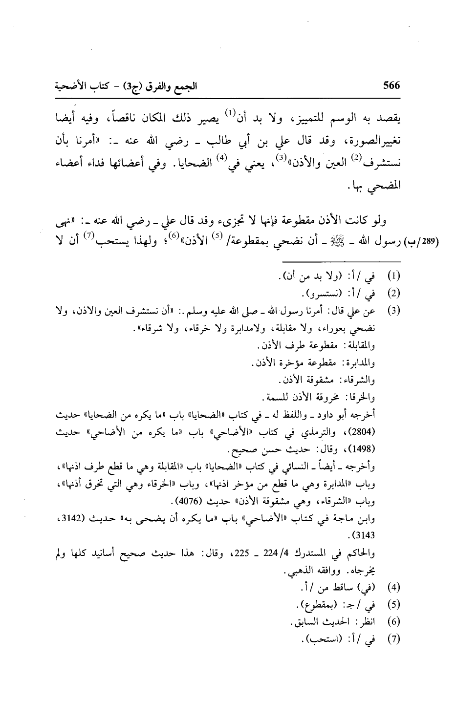 يقصد به الوسم للتمييز, ولابد أن يصير ذلك المكان ناقصًا, وفيه أيضًا تغيير الصورة, وقد قال علي بن أبي طالب - رضي الله عنه-: "أمرنا بأن نستشرف العين والأذن"، يعني في الضحايا وفي أعضائها فداء أعضاء المضحى بها.