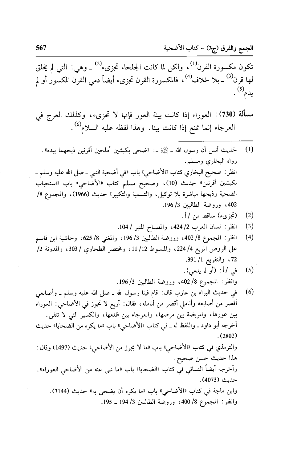 مسألة (٧٣٠): العوراء إذا كانت بينة العور فإنها لا تجزيء, وكذلك العرج في العرجاء إنما تمنع إذا كانت بينا, وهذه لفظه عليه السلام.