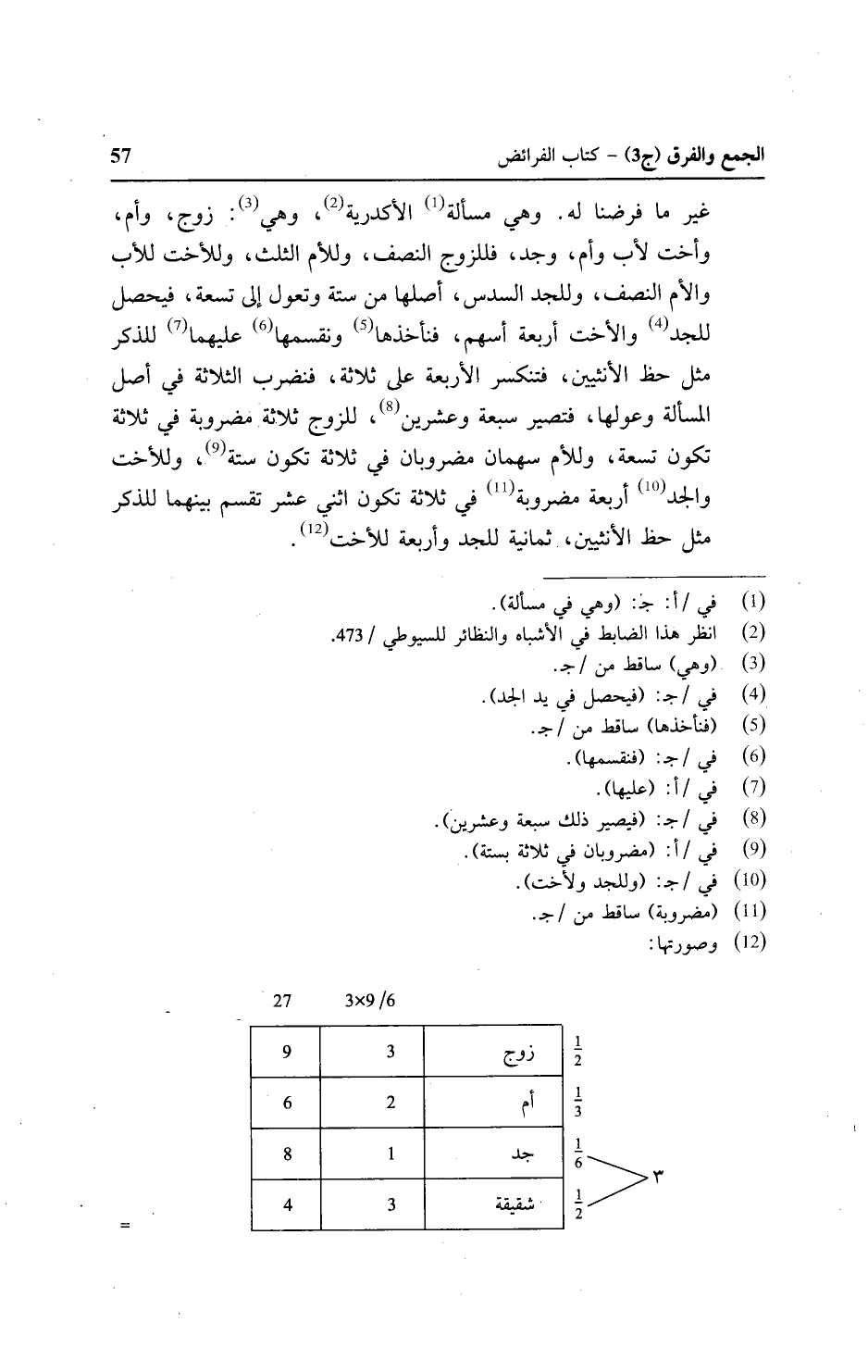 غير ما فرضنا له. وهي مسألة الأكدرية, وهي: زوج, وأم, وأخت لأب وأم, وجد, فللزوج النصف, وللأم الثلث, وللأخت للأب والأم النصف, وللجد السدس, أصلها من ستة وتعول إلى تسعة, فيحصل للجد والأخت أربعة أسهم, فنأخذها ونقسمها عليهما للذكر مثل حظ الأنثيين, فتنكسر الأربعة على ثلاثة, فنضرب الثلاثة في أصل المسألة وعولها, فتصير سبعة وعشرين, للزوج ثلاثة مضروبة في ثلاثة تكون تسعة, وللأم سهمان مضروبان في ثلاثة تكون ستة, وللأخت والجد أربعة مضروبة في ثلاثة تكون اثنى عشر تقسم بينهما للذكر مثل حظ الأنثيين, ثمانية للجد وأربعة للأخت.
