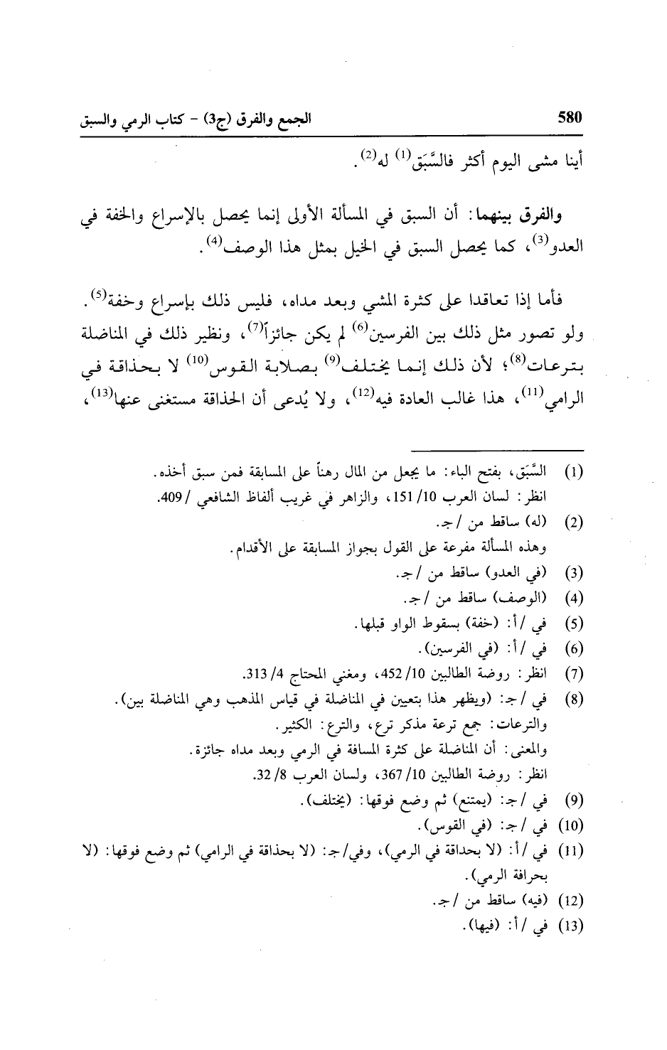 فأما إذا تعاقدا على كثرة المشي وبعد مداه، فليس ذلك بإسراع وخفة. ولو تصور مثل ذلك بين الفرسين لم يكن جائزًا، ونظير ذلك في المناضلة بترعات؛ لأن ذلك إنما يختلف بصلابة القوس لا بحذاقة في الرامي، هذا غالب العادة فيه، ولا يُدعى أن الحذاقة مستغنى عنها،