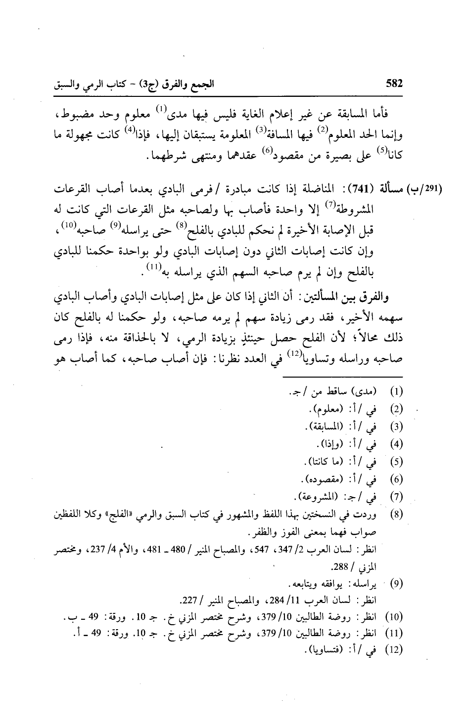 مسألة (٧٤١): المناضلة إذا كانت مبادرة/ (٢٩١/ ب) فرمى البادي بعدما أصاب القرعات المشروطة إلا واحدة فأصاب بها ولصاحبه مثل القرعات التي كانت له قبل الإصابة الأخيرة لم نحكم للبادي بالفلح حتى يراسله صاحبه، وإن كانت إصابات الثاني دون إصابات البادي ولو بواحدة حكمنا للبادئ بالفلح وإن لم يرم صاحبه السهم الذي يراسله به.