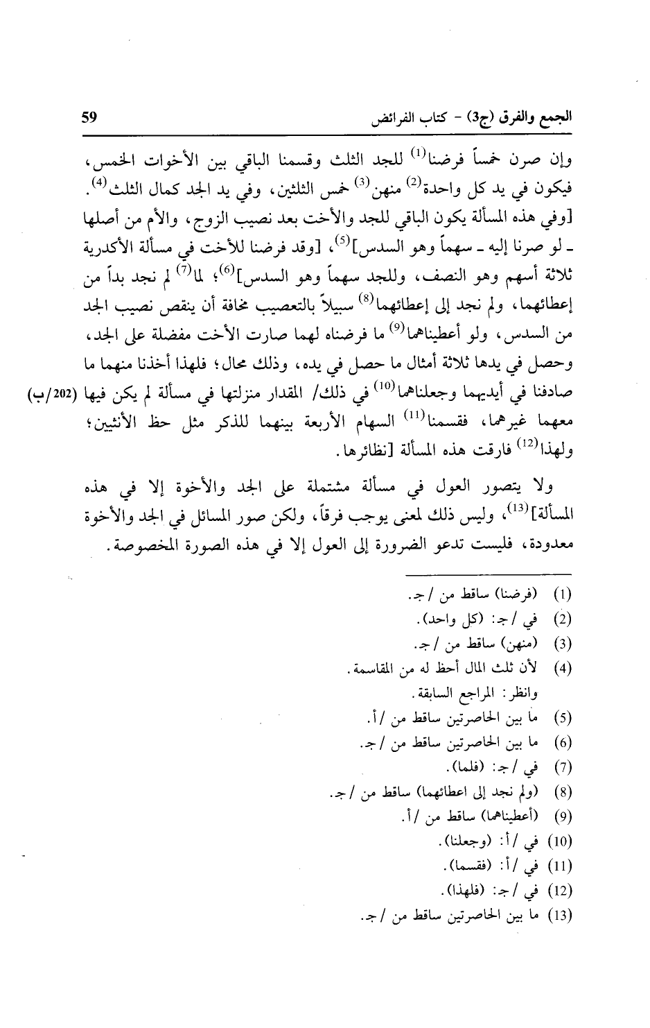 وإن صرن خمسًا فرضنا للجد الثلث وقسمنا الباقي بين الأخوات الخمس, فيكون في يد كل واحدة منهن خمس الثلثين, وفي يد الجد كمال الثلث.] وفي هذه المسألة يكون الباقي للجد والأخت بعد نصيب الزوج, والأم من أصلها - لو صرنا إليه - سهمًا وهو السدس [,] وقد فرضنا للأخت في مسألة الأكدرية ثلاثة أسهم وهو النصف, وللجد سهمًا وهو السدس [؛ لما لم نجد بدًا من إعطائهما, ولم نجد إلى إعطائهما سبيلًا بالتعصيب مخافة أن ينقص نصيب الجد من السدس, ولو أعطيناهما ما فرضناه لهما صارت الأخت مفضلة على الجد, وحصل في يدها ثلاثة أمثال ما حصل في يده, وذلك محال؛ فلهذا أخذنا منهما ما صادفنا في أيديهما وجعلناهما في ذلك/ (٢٠٢/ب) المقدار منزلتها في مسألة لم يكن فيها معهما غيرهما, فقسمنا السهام الأربعة بينهما للذكر مثل حظ الأنثيين؛ ولهذا فارقت هذه المسألة] نظائرها.