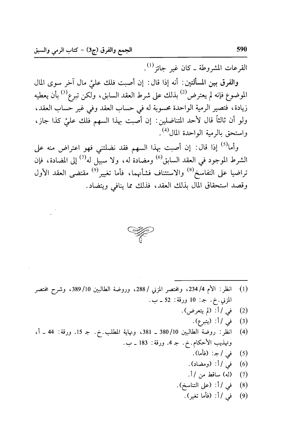 وأما إذا قال: إن أصبت بهذا السهم فقد نضلتني فهو اعتراض منه على الشرط الموجود في العقد السابق ومضادة له، ولا سبيل له إلى المضادة، فإن تراضيا على التفاسخ والاستئناف فشأنهما، فأما تغيير مقتضى العقد الأول وقصد استحقاق المال بذلك العقد، فذلك مما ينافي ويتضاد.
