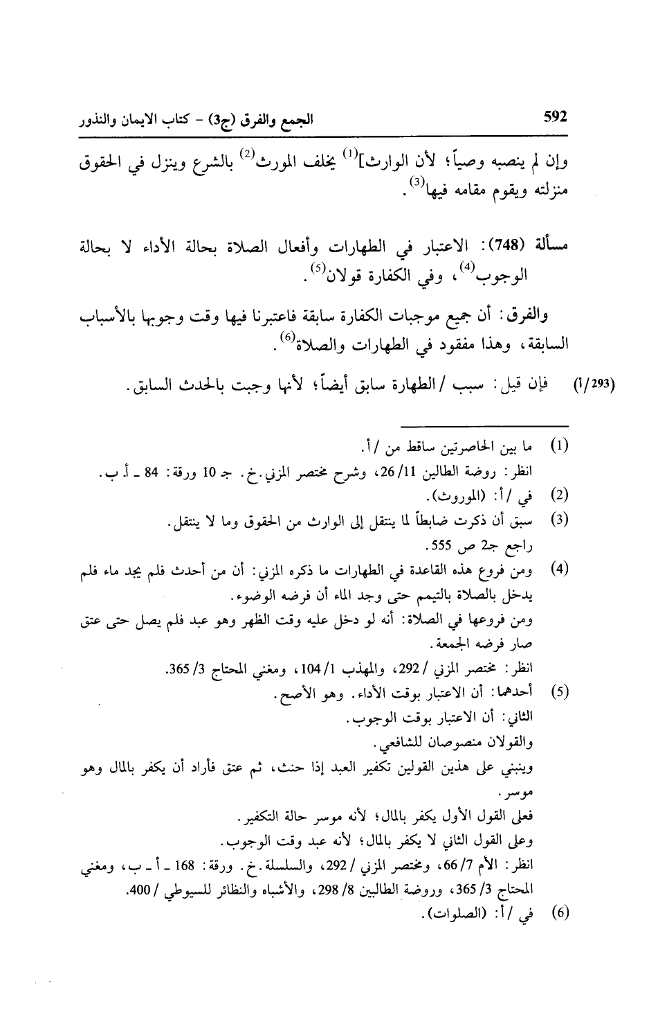 مسألة (٧٤٨): الاعتبار في الطهارات وأفعال الصلاة بحالة الأداء لا بحالة الوجوب، وفي الكفارة قولان.