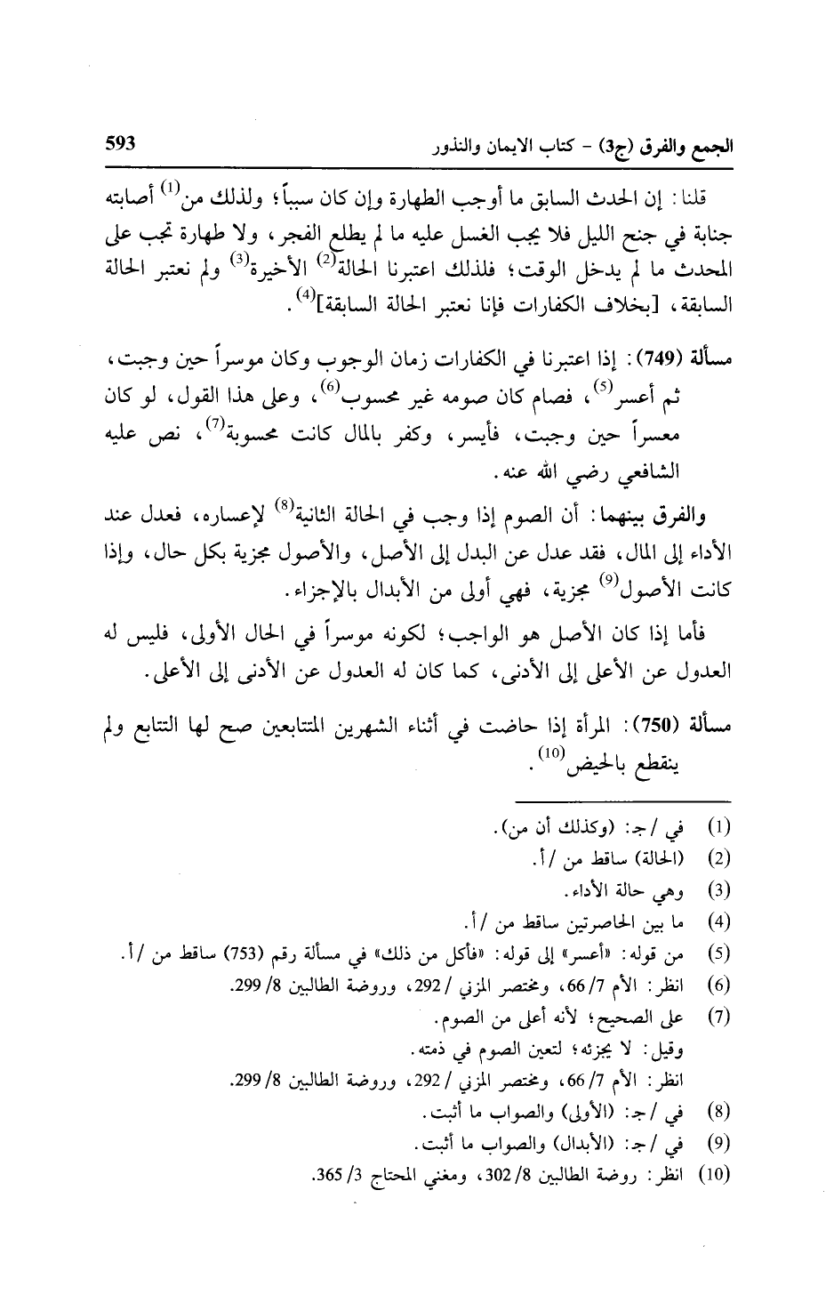 مسألة (٧٤٩): إذا اعتبرنا في الكفارات زمان الوجوب وكان موسرًا حين وجبت، ثم أعسر، فصام كان صومه غير محسوب، وعلى هذا القول، لو كان معسرًا حين وجبت، فأيسر، وكفر بالمال كانت محسوبة، نص عليه الشافعي رضي الله عنه.
