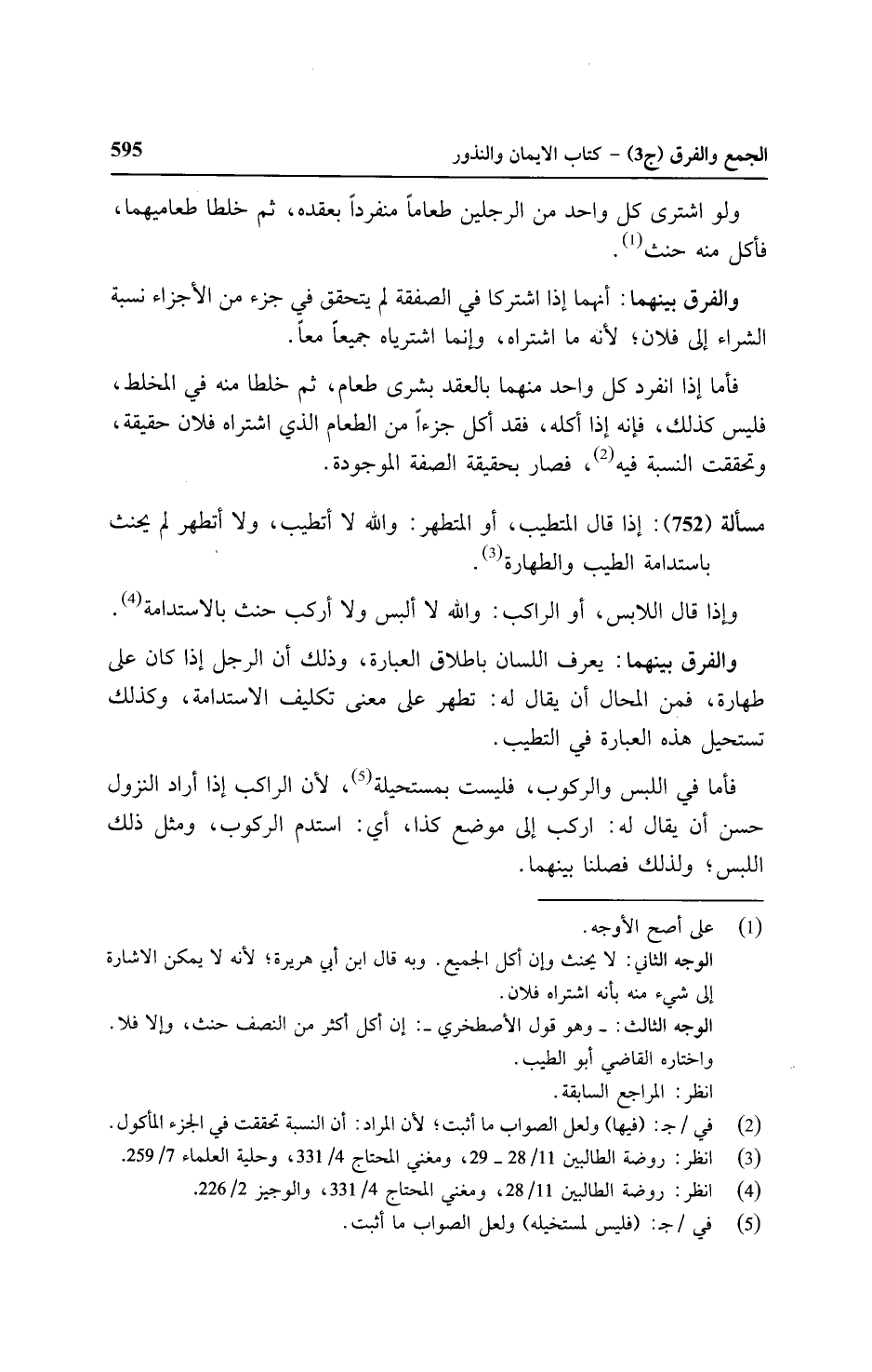 فأما إذا انفرد كل واحد منهما بالعقد بشرى طعام، ثم خلطا منه في المخلط، فليس كذلك، فإنه إذا أكله، فقد أكل جزءًا من الطعام الذي اشتراه فلان حقيقة، وتحققت النسبة فيه، فصار بحقيقة الصفة الموجودة.