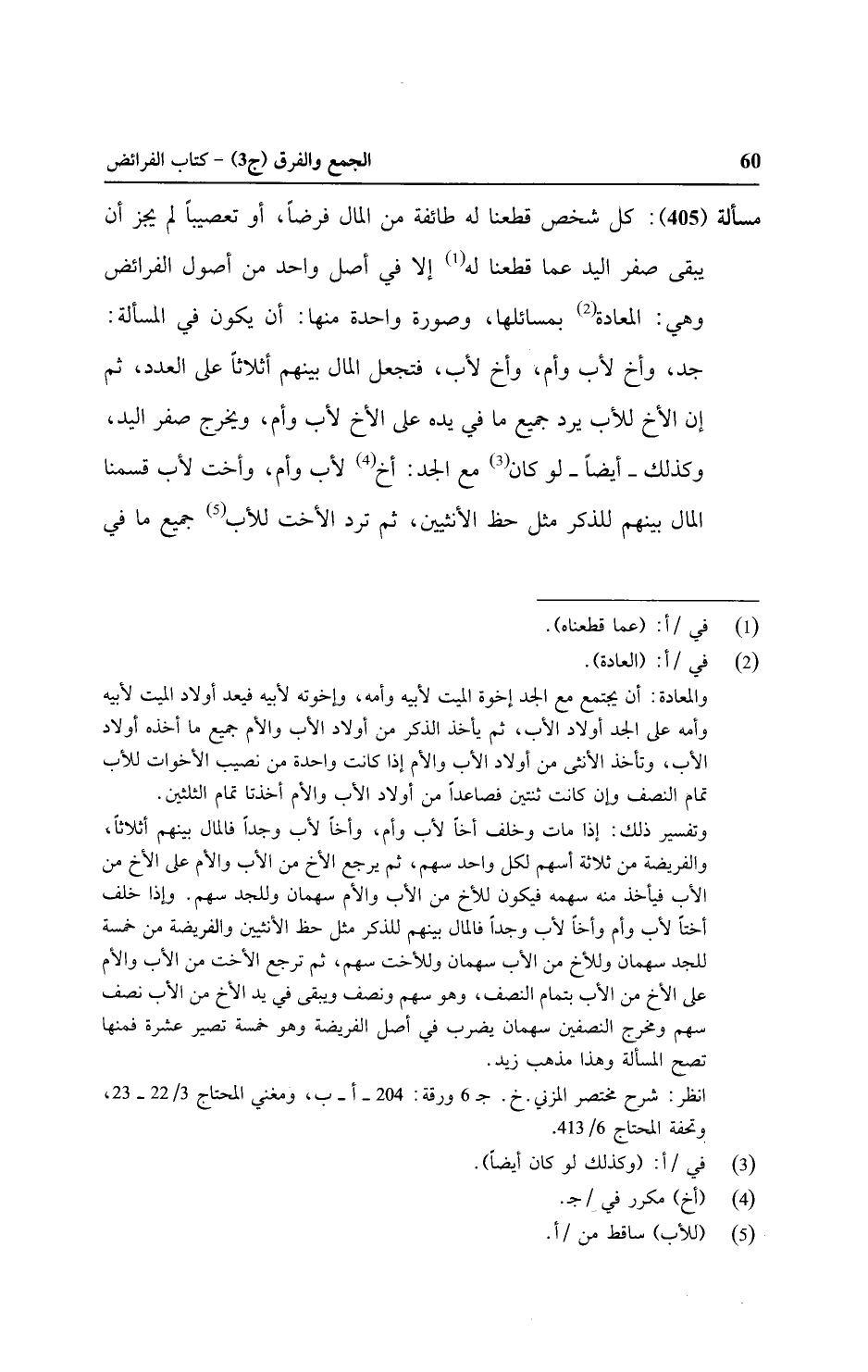 مسألة (٤٠٥): كل شخص قطعنا له طائفة من المال فرضًا, أو تعصيبًا لم يجز أن يبقى صفر اليد عما قطعنا له إلا في أصل واحد من أصول الفرائض وهي: المعادة بمسائلها, وصورة واحدة منها: أن يكون في المسألة: جد, وأخ لأب وأم, وأخ لأب, فتجعل المال بينهم أثلاثًا على العدد, ثم إن الأخ للأب يرد جميع ما في يده على الأخ لأب وأم, ويخرج صفر اليد, وكذلك - أيضًا- لو كان مع الجد: أخ لأب وأم, وأخت لأب قسمنا المال بينهم للذكر مثل حظ الأنثيين, ثم ترد الأخت للأب جميع ما في