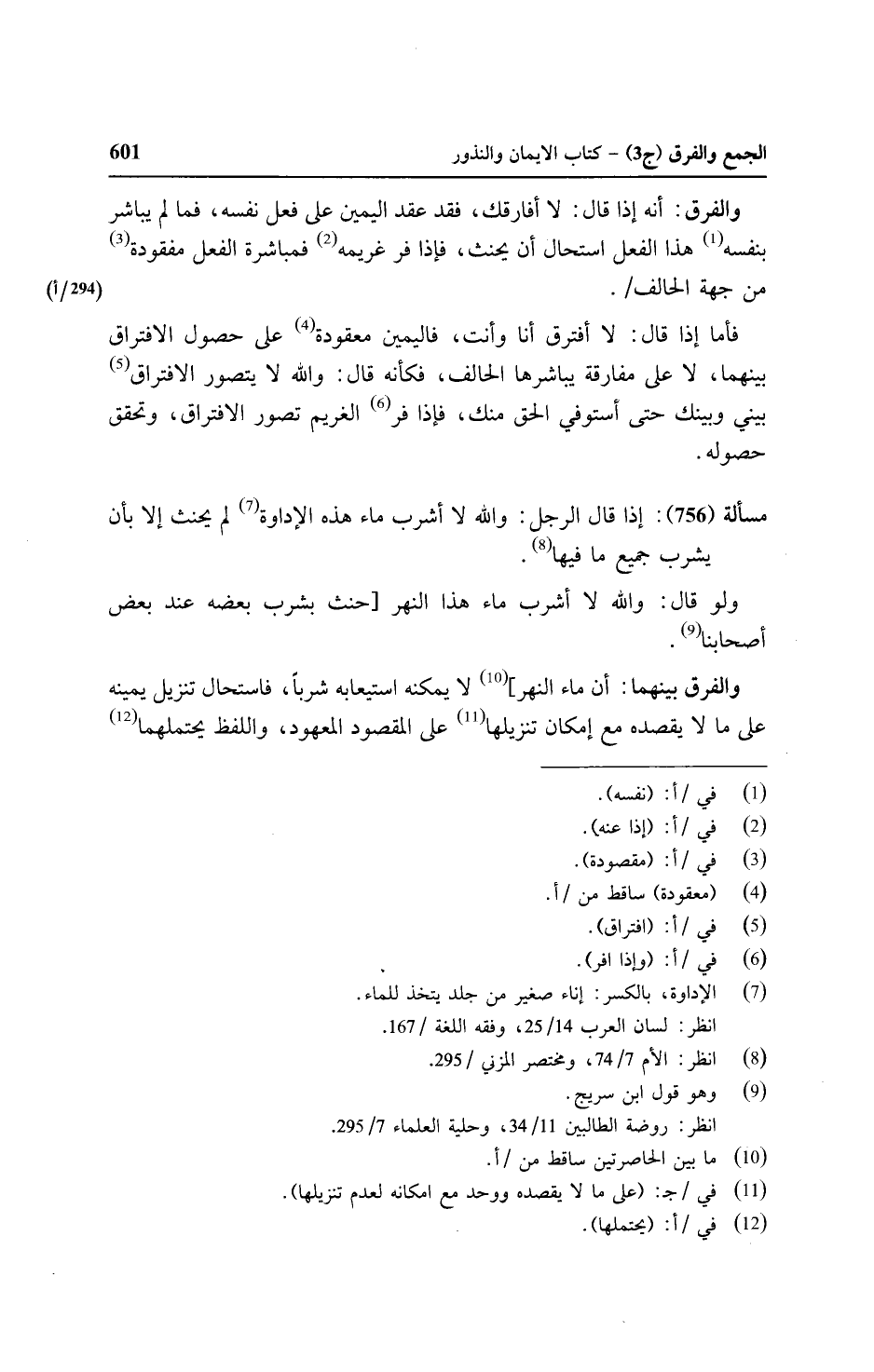 مسألة (٧٥٦): إذا قال الرجل: والله لا أشرب ماء هذه الإداوة لم يحنث إلا بأن يشرب جميع ما فيها.
