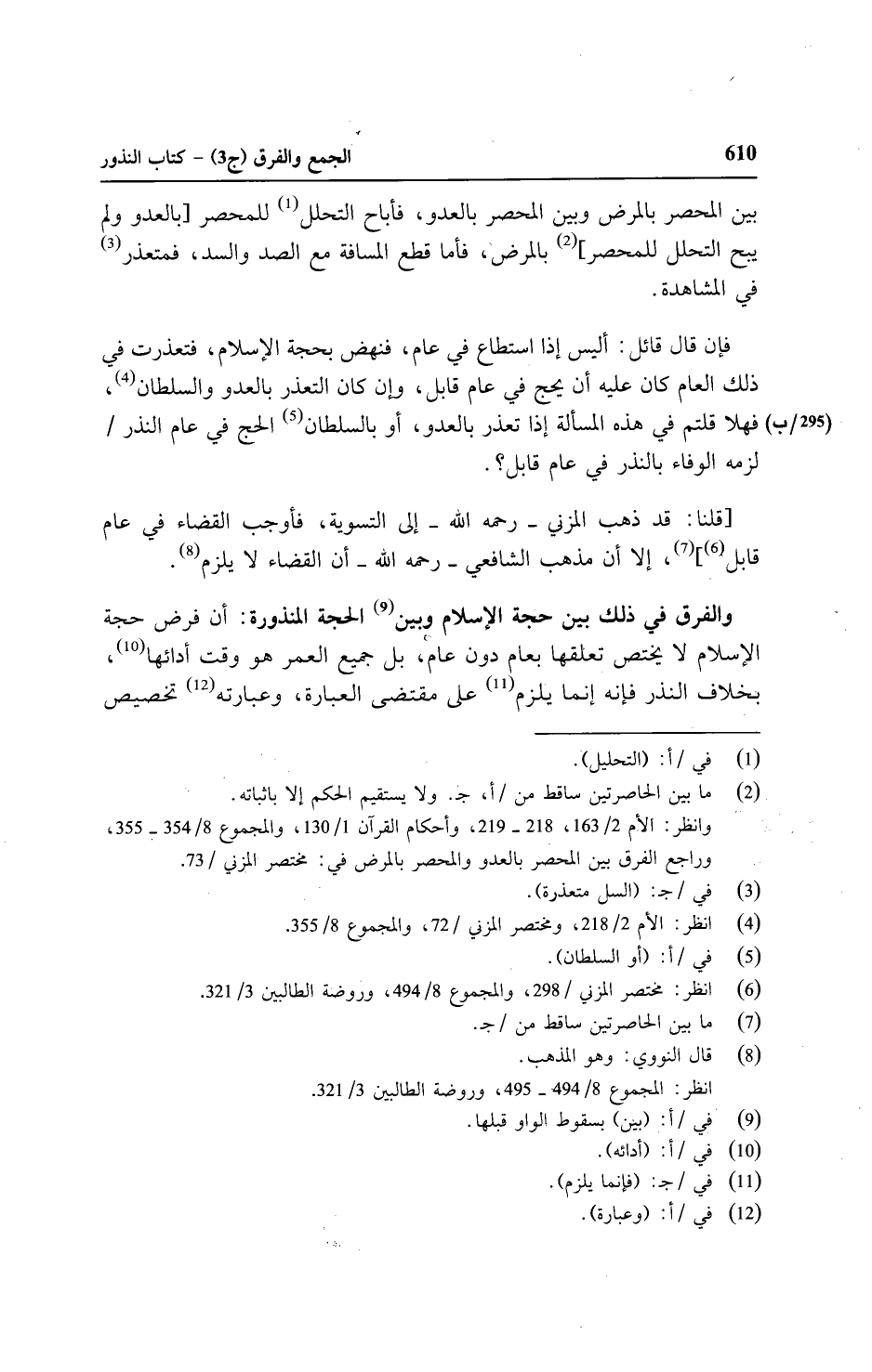 فإن قال قائل: أليس إذا استطاع في عام، فنهض بحجة الإسلام، فتعذرت في ذلك العام كان عليه أن يحج في عام قابل، وإن كان التعذر بالعدو والسلطان، فهلا قلتم في هذه المسألة إذا تعذر بالعدو، أو بالسلطان الحج في عام النذر/ (٢٩٥/ ب) لزمه الوفاء بالنذر في عام قابل؟
