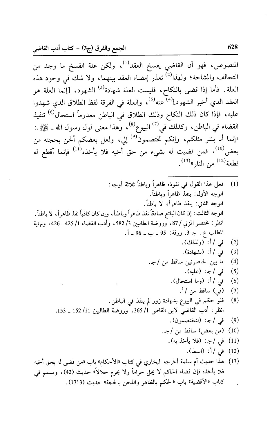المنصوص، فهو أن القاضي يفسخ العقد، ولكن علة الفسخ ما وجد من التحالف والمشاحة؛ ولهذا تعذر إمضاء العقد بينهما، ولا شك في وجود هذه العلة. فأما إذا قضي بالنكاح، فليست العلة شهادة الشهود، [إنما العلة هو العقد الذي أخبر الشهود] عنه، والعلة في الفرقة لفظن الطلاق الذي شهدوا عليه فإذا كان ذلك النكاح وذلك الطلاق في الباطن معدومًا استحال تنفيذ القضاء في الباطن، وكذلك في البيوع، وهذا معنى قول رسول الله - صلى الله عليه وسلم: "إنما أنا بشر مثلكم، وإنكم تختصمون إلي، ولعل بعضكم ألحن بحجته من بعض، فمن قضيت له بشيء من حق أخيه فلا يأخذه فإنما أقطع له قطعة من النار".