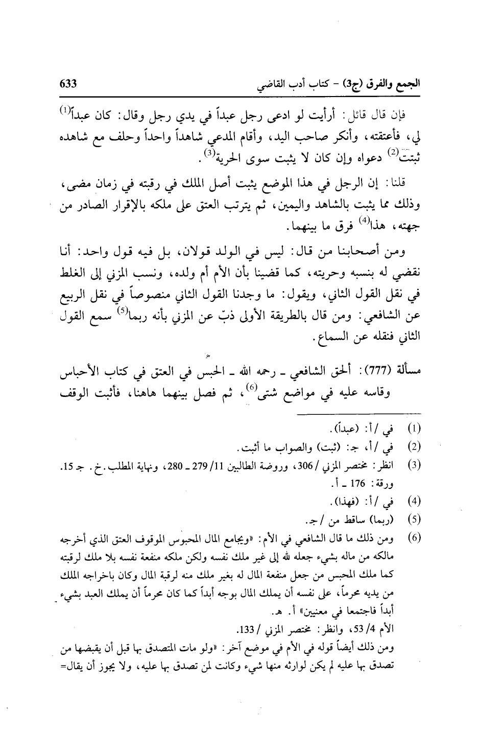 مسألة (٧٧٧): ألحق الشافعي- رحمه الله- الحبس في العتق في كتاب الأحباس وقاسه عليه في مواضع شتى، ثم فصل بينهما هاهنا، فأثبت الوقف