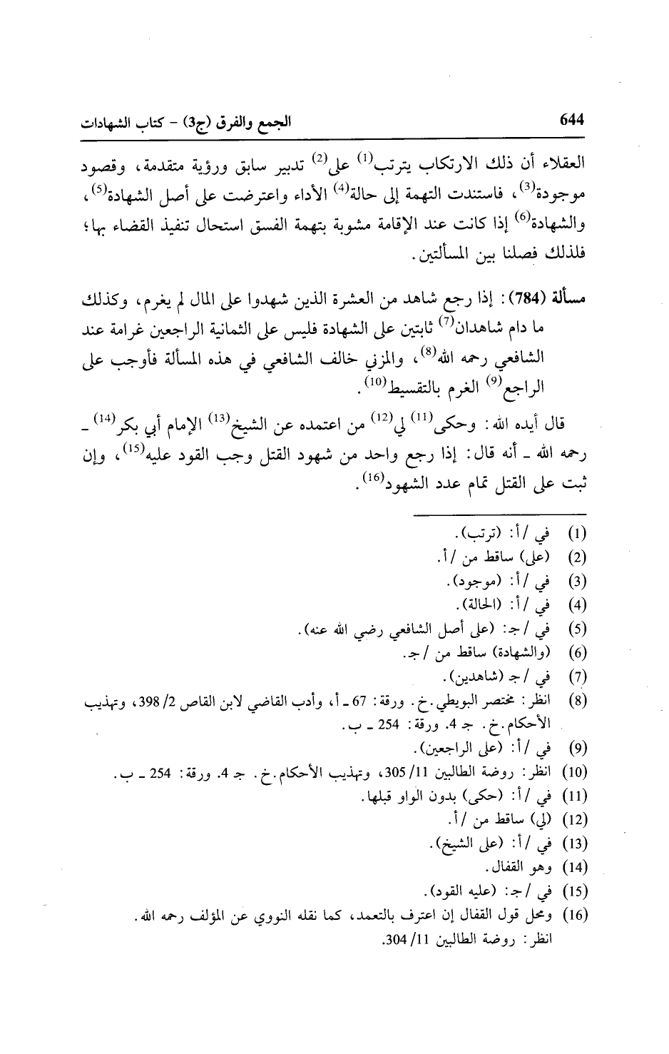 مسألة (٧٨٤): إذا رجع شاهد من العشرة الذين شهدوا على المال لم يغرم، وكذلك ما دام شاهدان ثابتين على الشهادة فليس على الثمانية الراجعين غرامة عند الشافعي رحمه الله، والمزني خالف الشافعي في هذه المسألة فأوجب على الراجع الغرم بالتقسيط.