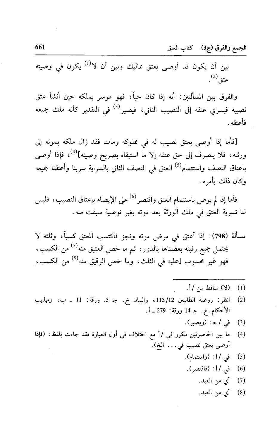 بين أن يكون قد أوصى بعتق مماليك وبين أن لا يكون في وصيته عتق.