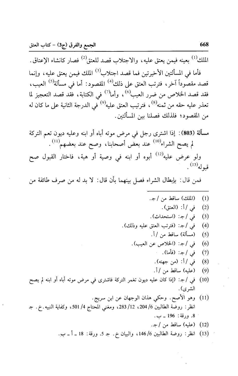 مسألة (٨٠٣): إذا اشترى رجل في مرض موته أباه أو ابنه وعليه ديون تعم التركة لم يصح الشراء عند بعض أصحابنا، وصح عند بعضهم.