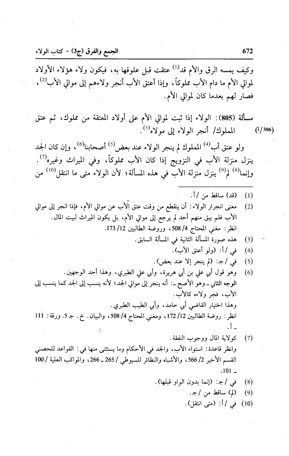 مسألة (٨٠٥): الولاء إذا ثبت لموالي الأم على أولاد المعتقة من مملوك، ثم عتق المملوك / (٣٠٦/ أ) أنجر الولاء إلى مولاه.