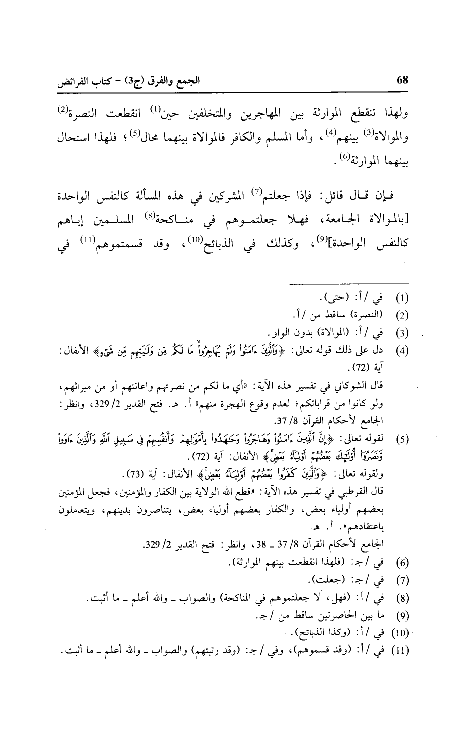 فإن قال قائل: فإذا جعلتم المشركين في هذه المسألة كالنفس الواحدة] بالموالاة الجامعة, فهلا جعلتموهم في مناكحة المسلمين إياهم كالنفس الواحدة [, وكذلك في الذبائح, وقد قسمتموهم في