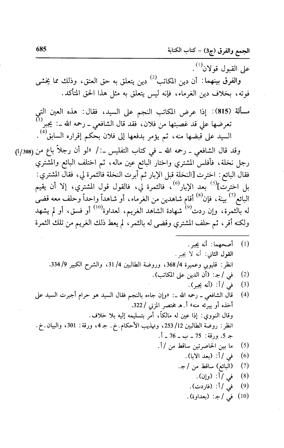 مسألة (٨١٥): إذا عرض المكاتب النجم على السيد، فقال: هذه العين التي تعرضها علي قد غصبتها من فلان، فقد قال الشافعي - رحمه الله-: يجبر السيد على قبضها منه، ثم يؤمر بدفعها إلى فلان بحكم إقراره السابق.