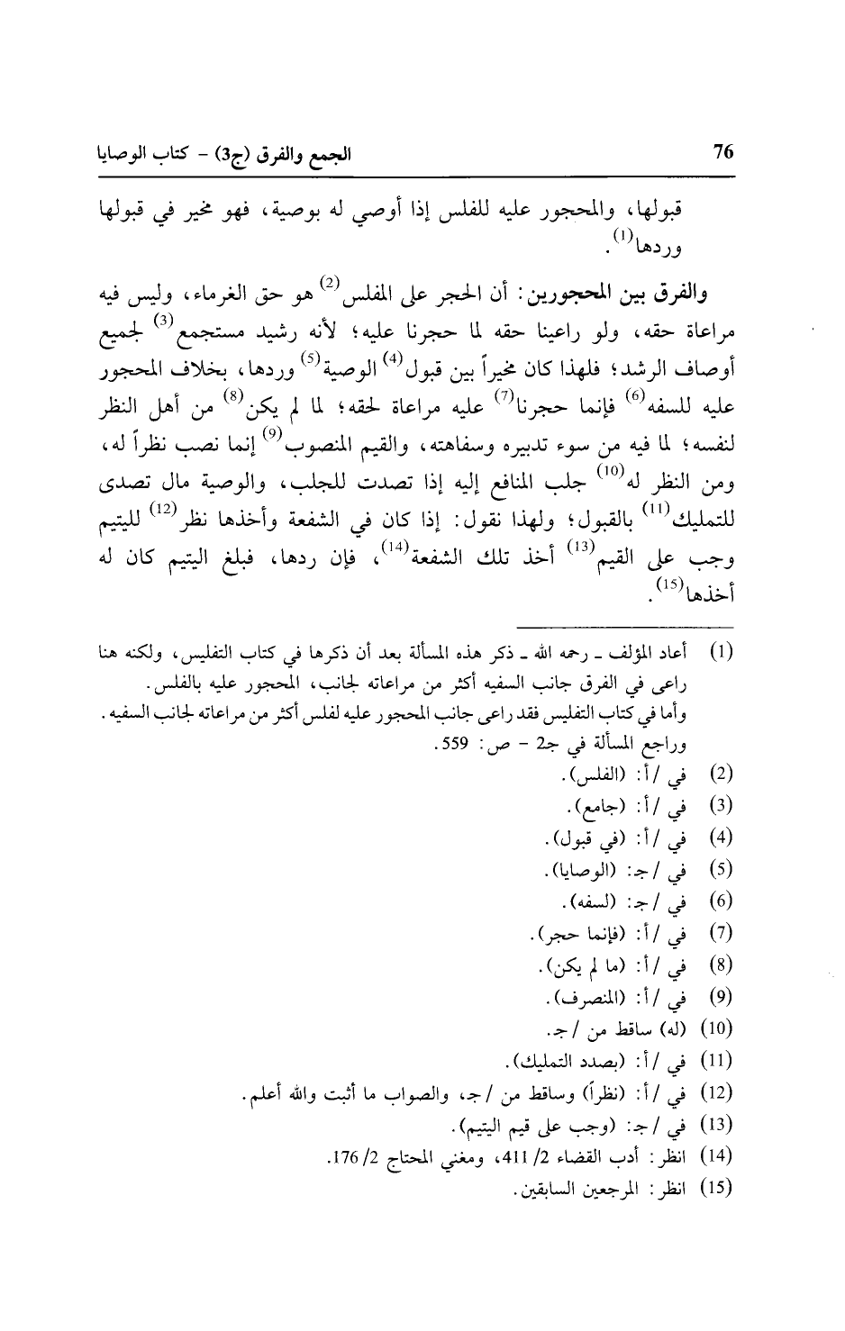 والفرق بين المحجورين: أن الحجر على المفلس هو حق الغرماء, وليس فيه مراعاة حقه, ولو راعينا حقه لما حجرنا عليه؛ لأنه رشيد مستجمع لجميع أوصاف الرشد؛ فلهذا كان مخيرًا بين قبول الوصية وردها, بخلاف المحجور عليه للسفه فإنما حجرنا عليه مراعاة لحقه؛ لما لم يكن من أهل النظر لنفسه؛ لما فيه من سوء تدبيره وسفاهته, والقيم المنصوب إنما نصب نظرًا له, ومن النظر له جلب المنافع إليه إذا تصدت للجلب, والوصية مال تصدى للتمليك بالقبول؛ ولهذا نقول: إذا كان في الشفعة وأخذها نظر لليتيم وجب على القيم أخذ تلك الشفعة, فإن ردها, فبلغ اليتيم كان له أخذها.
