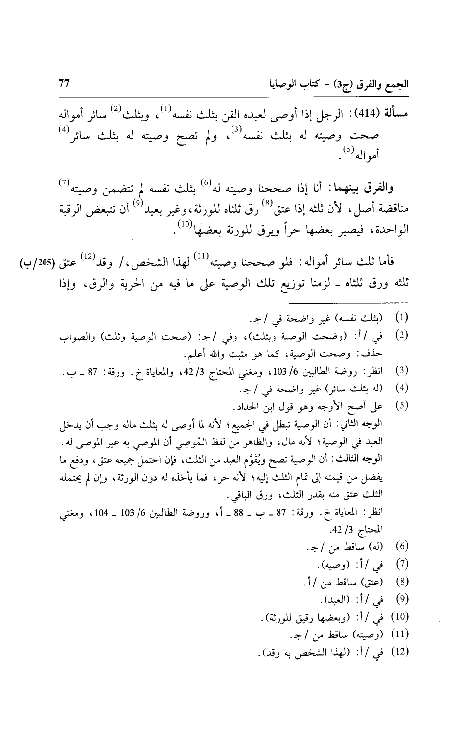 مسألة (٤١٤): الرجل إذا أوصى لعبده القن بثلث نفسه, وبثلث سائر أمواله صحت وصيته له بثلث نفسه, ولم تصح وصيته له بثلث سائر أمواله.