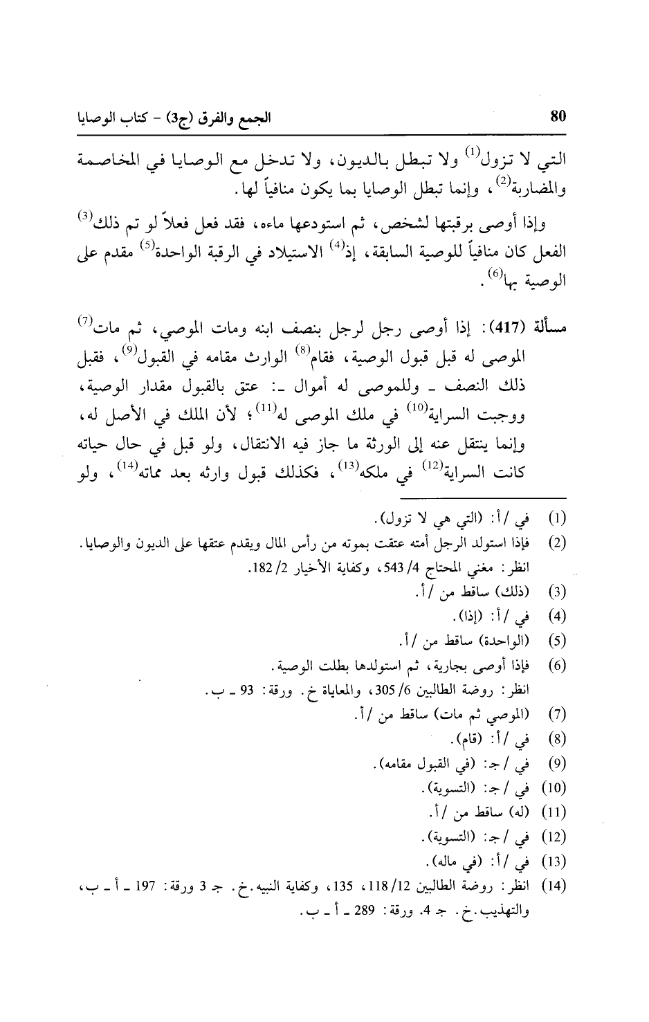 مسألة (٤١٧): إذا أوصى رجل لرجل بنصف ابنه ومات الوصي, ثم مات الموصى له قبل قبول الوصية, فقام الوارث مقامه في القبول, فقبل ذلك النصف - وللموصى له أموال -: عتق بالقبول مقدار الوصية, ووجبت السراية في ملك الموصى له؛ لأن الملك في الأصل له, وإنما ينتقل عنه إلى الورثة ما جاز فيه الانتقال, ولو قبل في حال حياته كانت السراية في ملكه, فكذلك قبول وارثه بعد مماته, ولو
