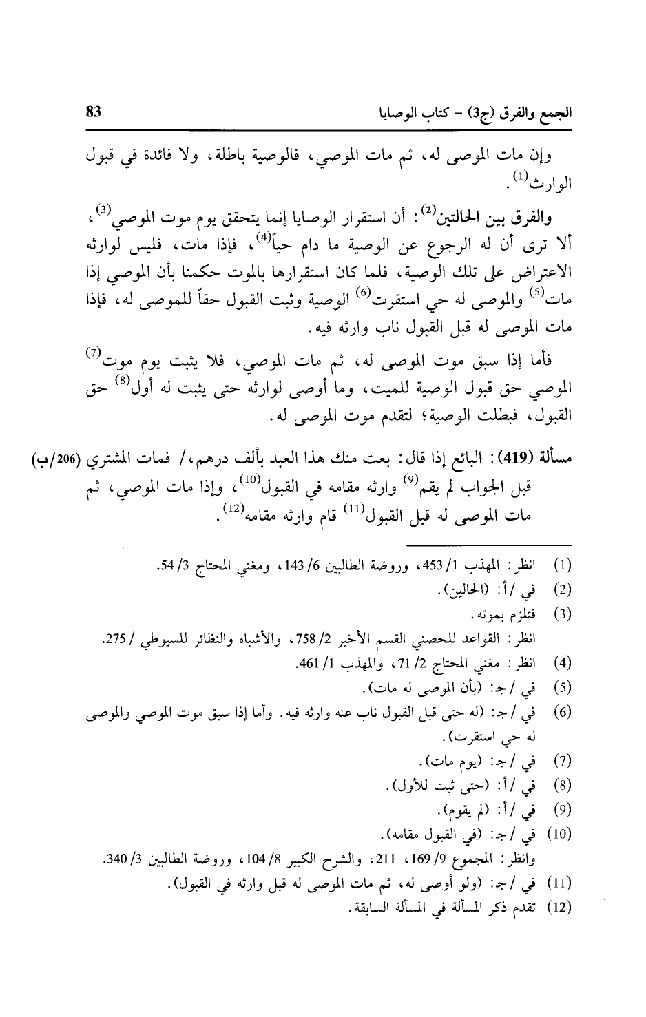 مسألة (٤١٩): البائع إذا قال: بعت منك هذا العبد بألف درهم, فمات المشتري قبل الجواب لم يقم وارثه مقامه في القبول, وإذا مات الموصي, ثم مات الموصى له قبل القبول قام وارثه مقامه.
