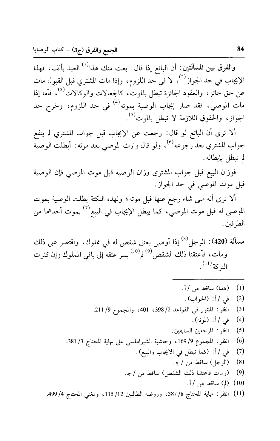 والفرق بين المسألتين: أن البائع إذا قال: بعت منك هذا العبد بألف, فهذا الإيجاب في حد الجواز, لا في حد اللزوم, وإذا مات المشتري قبل القبول مات عن حق جائز, والعقود جائزة تبطل بالموت, كالجعالات والوكالات, فأما إذا مات الموصي, فقد صار إيجاب الوصية بموته في حد اللزوم, وخرج حد الجواز, والحقوق اللازمة لا تبطل بالموت.