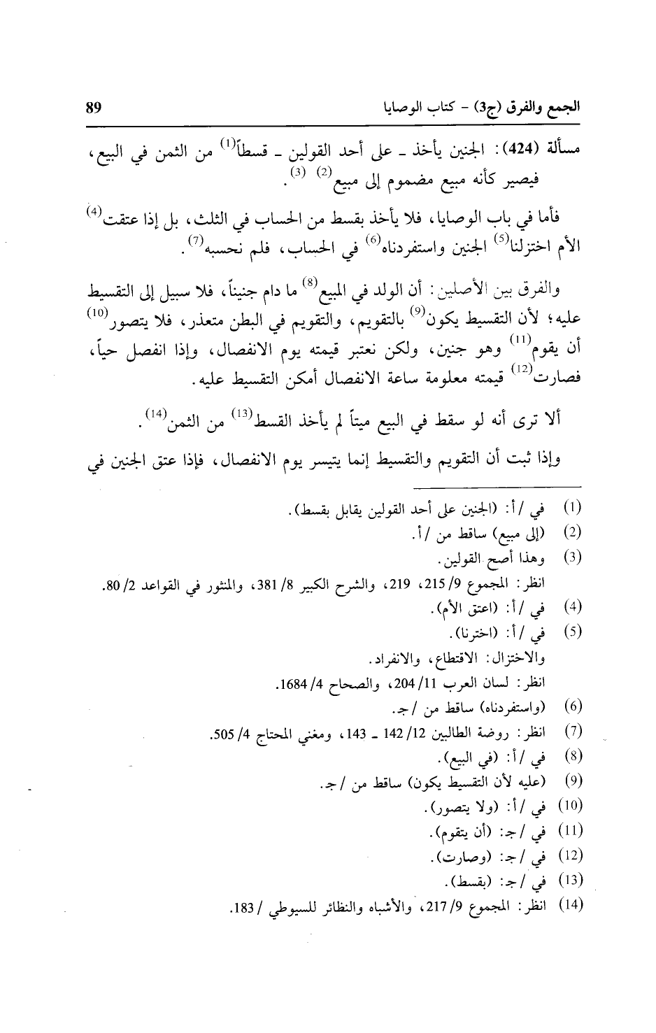 مسألة (٤٢٤): الجنين يأخذ - على أحد القولين - قسطًا من الثمن في البيع, فيصير كأنه مبيع مضموم إلى مبيع.