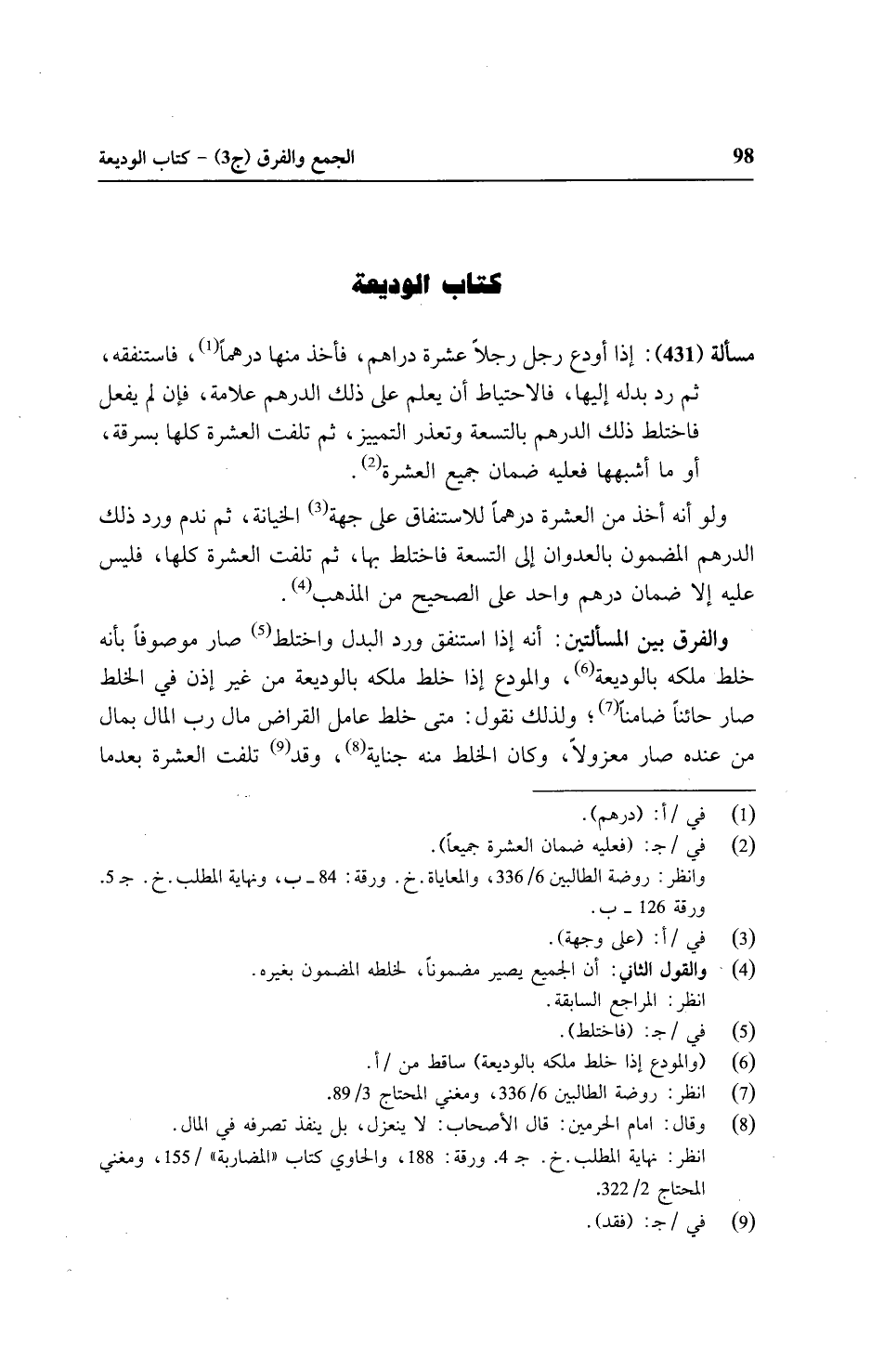 مسألة (٤٣١): إذا أودع رجلًا عشرة دراهم، فأخذ منها درهمًا، فاستنفقه، ثم رد بدله إليها، فالاحتياط أن يعلم على ذلك الدرهم علامة، فإن لم يفعل فاختلط ذلك الدرهم بالتسعة وتعذر التمييز، ثم تلفت العشرة كلها بسرقة أو ما أشبهها فعليه ضمان جميع العشرة.