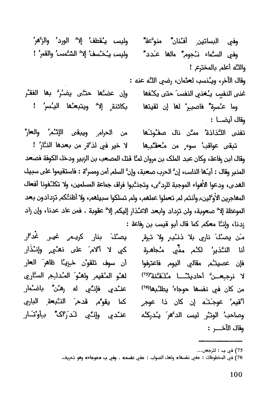 وقال أبن رفاعة وكان عبد الملك بن مروان لمّا قتل المصعب بن الزبير ودخل الكوفة فصعد المنبر وقال: أيها الناس إنَّ الحرب صعبة وإنَّ السلم أمن ومسرة: فاستقيموا على سبيل الهدى ودعوا الأهواء الموجبة للردى وتجنبوا فراق جماعة المسلمين ولا تكلفونا أفعال المهاجرين الأولين وأنتم لم تعملوا عملهم ولم تسلكوا سبيلهم ولا اظنكو تزدادون بعد الموعظة إلاّ صعوبة ولن تزداد وابعد الأعذار إليكم إلاّ عقوبة. فمن عاد عدنا وإن زاد زدنا وإنَّا معكم كما قال أبو قيس بن رفاعة: