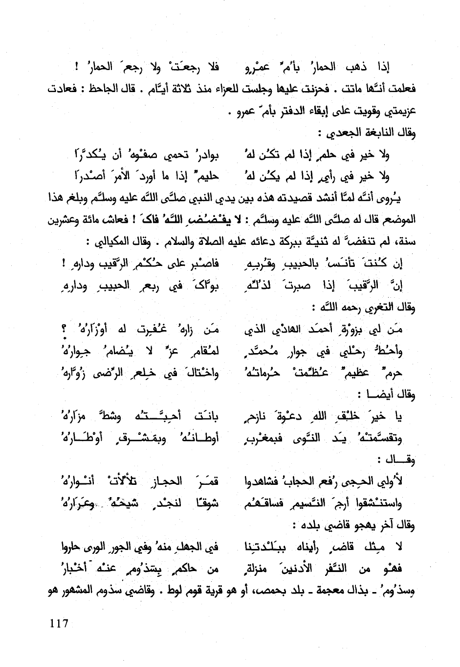 فعلمت إنّها ماتت. فحزنت ليها وجلست للعزاء منذ ثلاثة أيام. قال الجاحظ: فعادت عزيمتي وقويت على إبقاء الدفتر بأم عمرو.