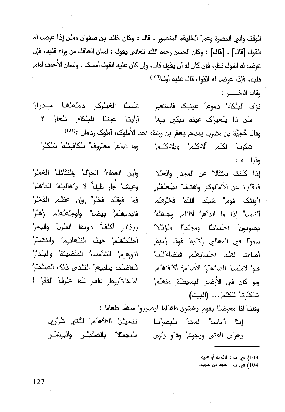 الوقت والي البصرة وعم الخليفة المنصور. قال: وكان خالد بن صفوان ممن إذا عرض له القول قال: وكان الحسن رحمه الله تعالى يقال: لسان العاقل من وراء قلبه فإن عرض له القول نظر فإن كان له أن يقول قال وإن كان عليه القول أمسك. ولسان الأحمق إمام قلبه فإذا عرض له القول فال عليه أو له.
